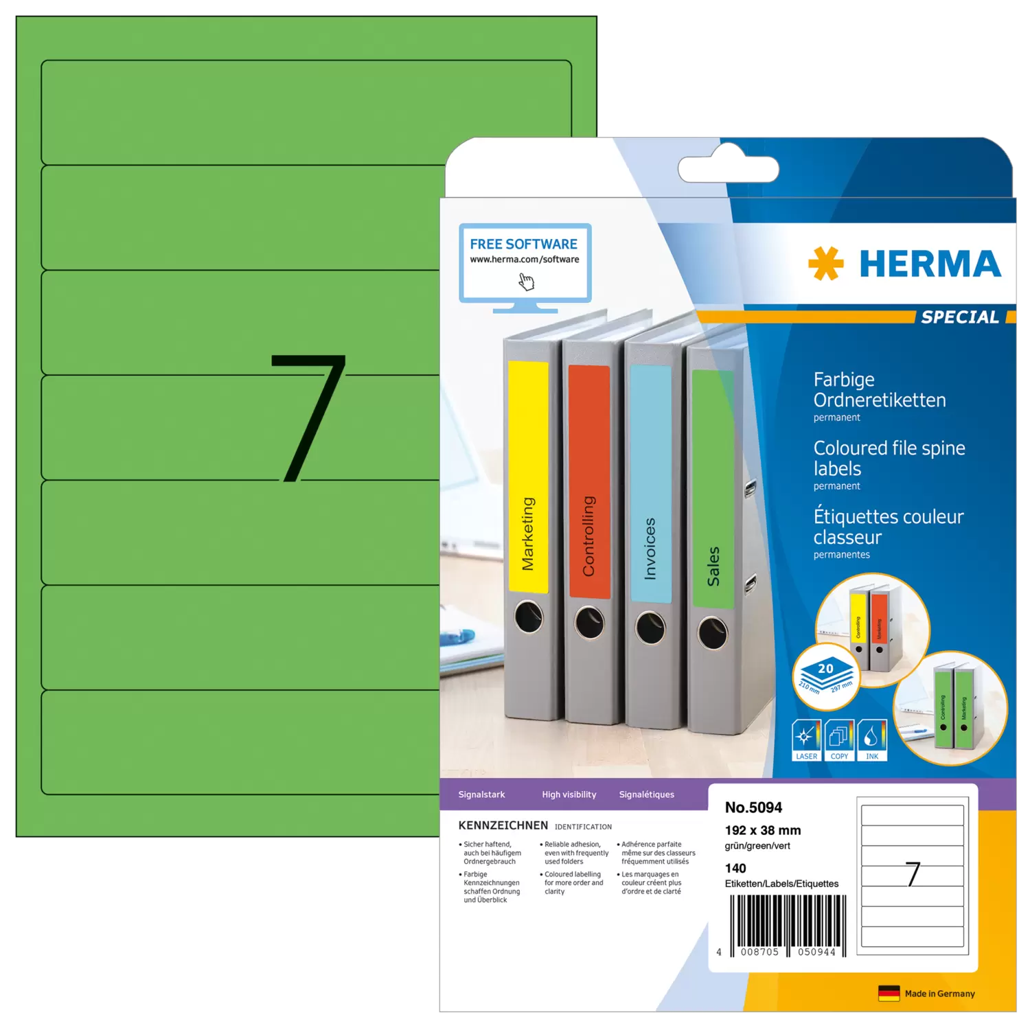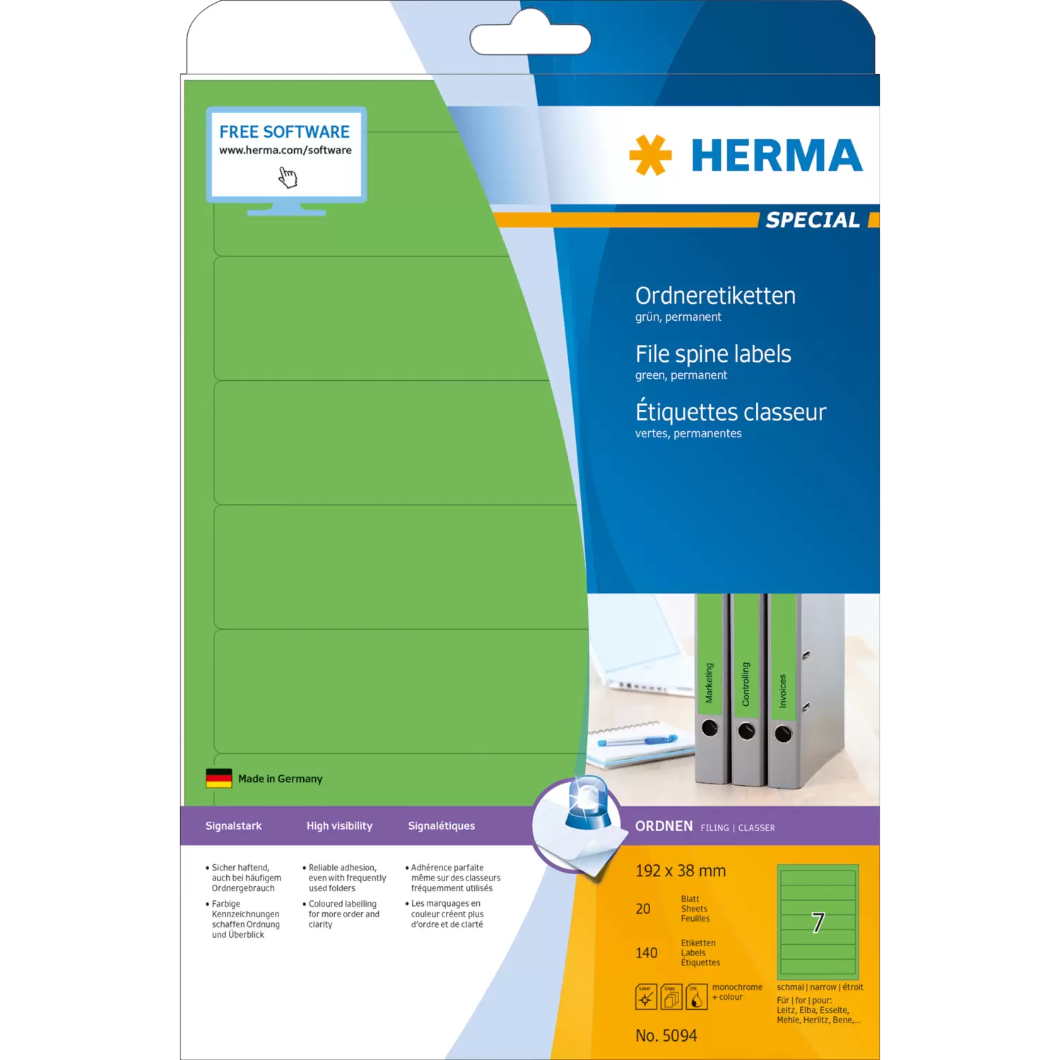 Ordneretiketten auf A4-Blättern, selbstklebend. Für ein einheitliches Erscheinungsbild im Büro und Zuhause. Für alle gängigen Ordner geeignet. Blanko: Ideal für Firmenlogo, Beschriftungen und Ordnungsvermerke. Sicher haftend, auch bei häufigem Ordnergebrauch. Umweltfreundlich: hochwertiges, chlorfrei gebleichtes Spezialpapier, lösemittelfreier Haftkleber. Etiketten sind 100 % recyclingfähig mit dem Altpapier, Verpackung aus Recyclingkarton. Sehr gute Druckergebnisse auf allen Laser- und Inkjetdruckern, Kopierern, Farblaserdruckern und Farbkopierern. Störungsfreie Verarbeitung durch Rundum-Sicherheitskante und optimale Planlage. Kostenlose Softwarelösungen: www.herma.de/software.
