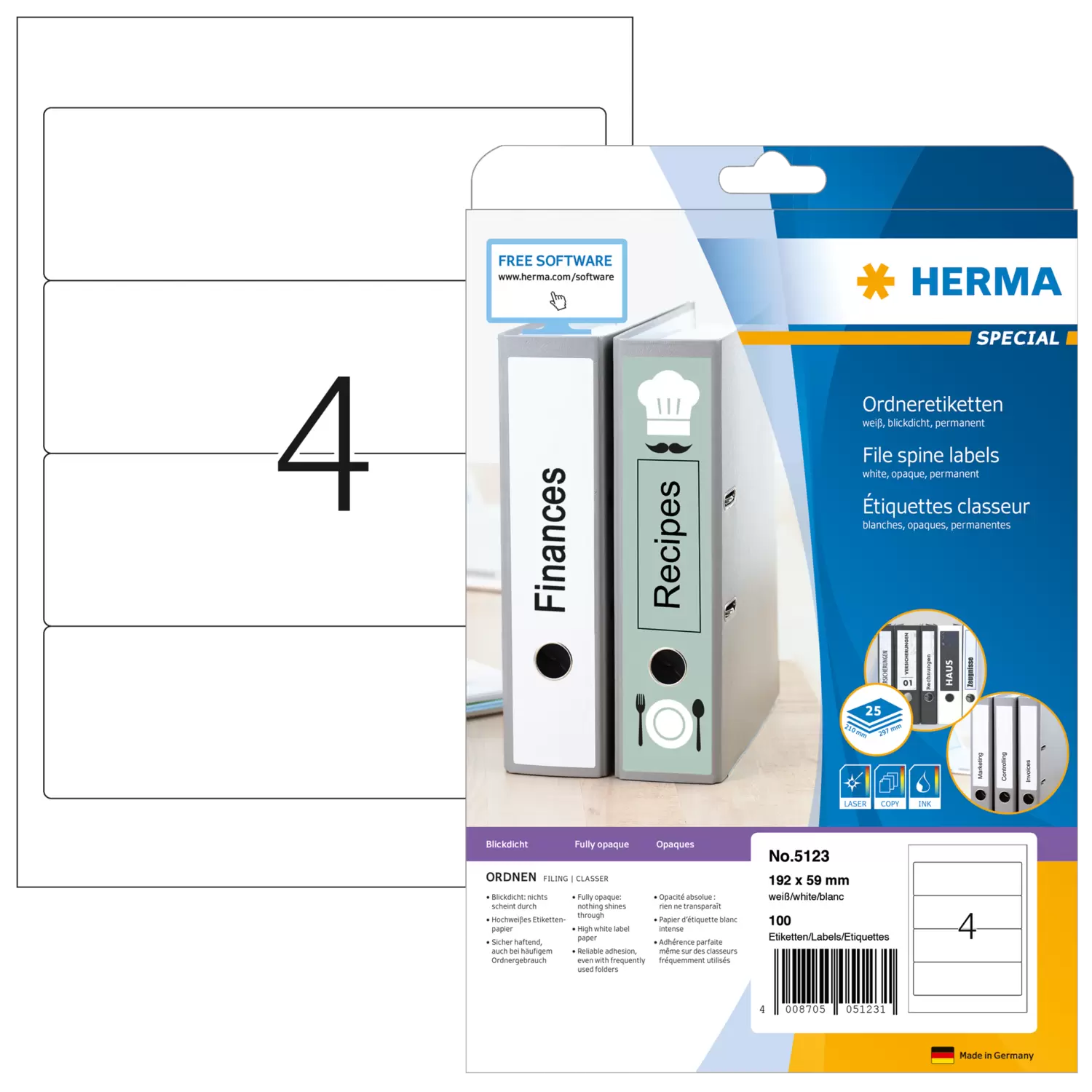 Ordneretiketten auf A4-Blättern, selbstklebend. Für ein einheitliches Erscheinungsbild im Büro und Zuhause. Für alle gängigen Ordner geeignet. Absolut blickdichtes Material mit hohem Weißgrad, alte Ordnerbeschriftungen scheinen nicht durch. Blanko: Ideal für Firmenlogo, Beschriftungen und Ordnungsvermerke. Sicher haftend, auch bei häufigem Ordnergebrauch. Umweltfreundlich: hochwertiges, chlorfrei gebleichtes Spezialpapier, FSC® Mix Credit-zertifiziert, lösemittelfreier Haftkleber. Etiketten sind 100 % recyclingfähig mit dem Altpapier, Verpackung aus Recyclingkarton. Sehr gute Druckergebnisse auf allen Laser- und Inkjetdruckern, Kopierern, Farblaserdruckern und Farbkopierern. Störungsfreie Verarbeitung durch Rundum-Sicherheitskante und optimale Planlage. Kostenlose Softwarelösungen: www.herma.de/software.