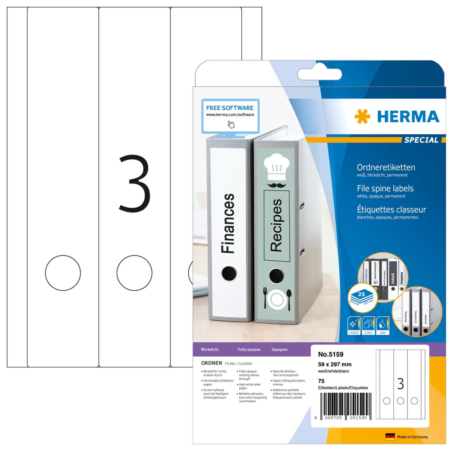 Ordneretiketten A4, 59 x 297 mm, weiß, blickdicht, permanent haftend, für breite Ordner (kurz)