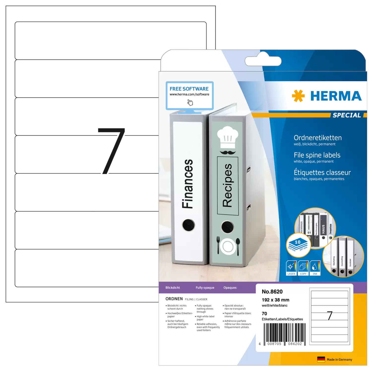 Ordneretiketten A4, 192 x 38 mm, weiß, blickdicht, permanent haftend, für schmale Ordner (kurz)