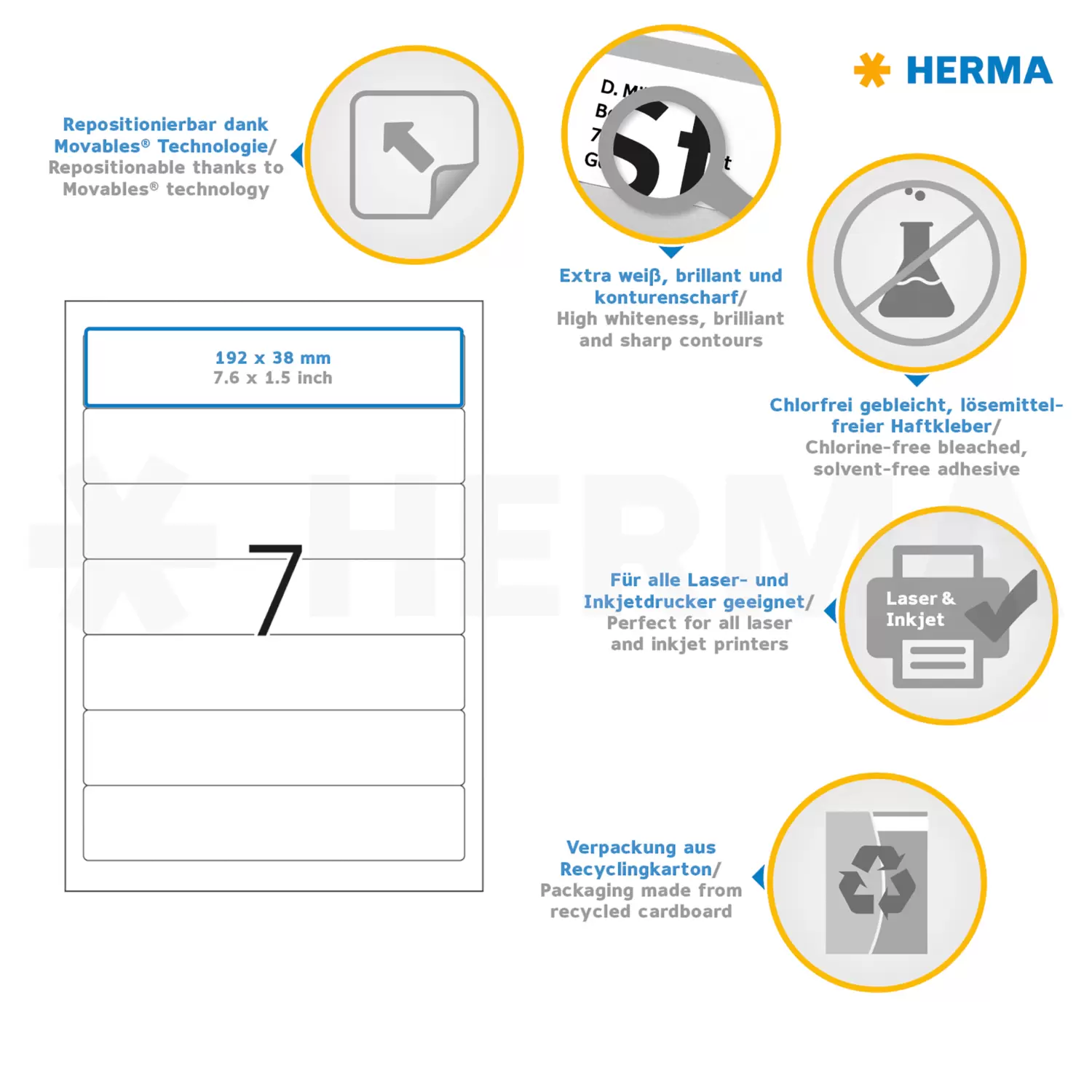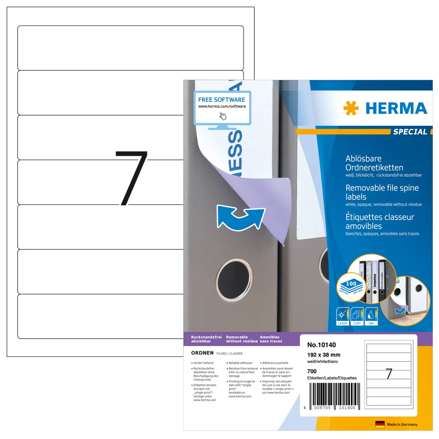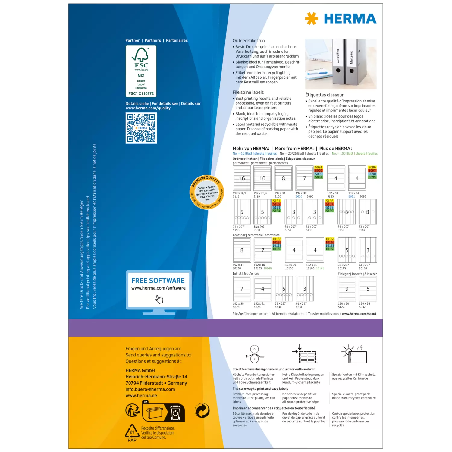 Ablösbare Ordneretiketten auf A4-Blättern. Sicher haftend, auch bei häufigem Ordnergebrauch, rückstandsfrei wieder abziehbar ohne den Ordner zu beschädigen. Absolut blickdichtes Material mit hohem Weißgrad, alte Ordnerbeschriftungen scheinen nicht durch. Blanko: Ideal für Firmenlogo, Beschriftungen und Ordnungsvermerke. Umweltfreundlich: FSC® Mix Credit-zertifiziert, chlorfrei gebleicht, lösemittelfreier Haftkleber. Etiketten sind 100 % recyclingfähig mit dem Altpapier, Verpackung aus Recyclingkarton. Sehr gute Druckergebnisse auf allen Laser- und Inkjetdruckern, Kopierern, Farblaserdruckern und Farbkopierern. Störungsfreie Verarbeitung durch Rundum-Sicherheitskante und optimale Planlage. Kostenlose Softwarelösungen: www.herma.de/software.