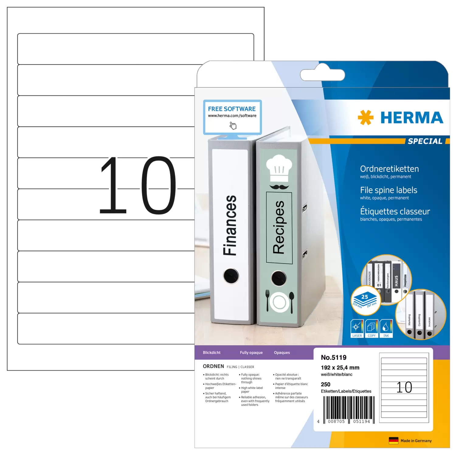 Ordneretiketten auf A4-Blättern, selbstklebend. Für ein einheitliches Erscheinungsbild im Büro und Zuhause. Für alle gängigen Ordner geeignet. Absolut blickdichtes Material mit hohem Weißgrad, alte Ordnerbeschriftungen scheinen nicht durch. Blanko: Ideal für Firmenlogo, Beschriftungen und Ordnungsvermerke. Sicher haftend, auch bei häufigem Ordnergebrauch. Umweltfreundlich: hochwertiges, chlorfrei gebleichtes Spezialpapier, FSC® Mix Credit-zertifiziert, lösemittelfreier Haftkleber. Etiketten sind 100 % recyclingfähig mit dem Altpapier, Verpackung aus Recyclingkarton. Sehr gute Druckergebnisse auf allen Laser- und Inkjetdruckern, Kopierern, Farblaserdruckern und Farbkopierern. Störungsfreie Verarbeitung durch Rundum-Sicherheitskante und optimale Planlage. Kostenlose Softwarelösungen: www.herma.de/software.