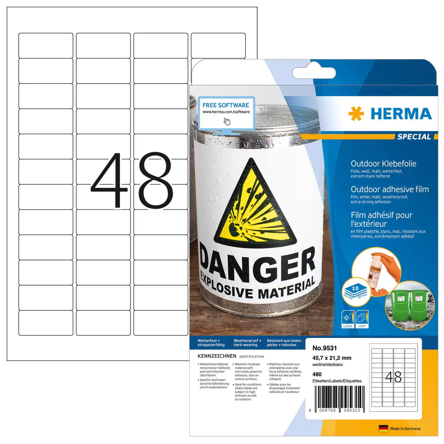 Wetterfeste Etiketten aus weißer, matter Polyethylen-Folie, selbstklebend. Ideal für Outdoor-Anwendungen und stark beanspruchte Etikettierungen: Eigentumsetiketten, Schaufensteraufkleber, Hinweis- und Warnschilder, Kennzeichnungen in Lager und Produktion. Extrem stark haftend, auch auf kritischen Oberflächen. Wetterfest, dehnfähig, alterungsbeständig, Öl und Schmutz abweisend, abwaschbar, temperaturbeständig von -40 bis +150 °C, seewasserbeständig. Für Laserdrucker, Kopierer, Farblaserdrucker und Farbkopierer. Kostenlose Softwarelösungen: www.herma.de/software.