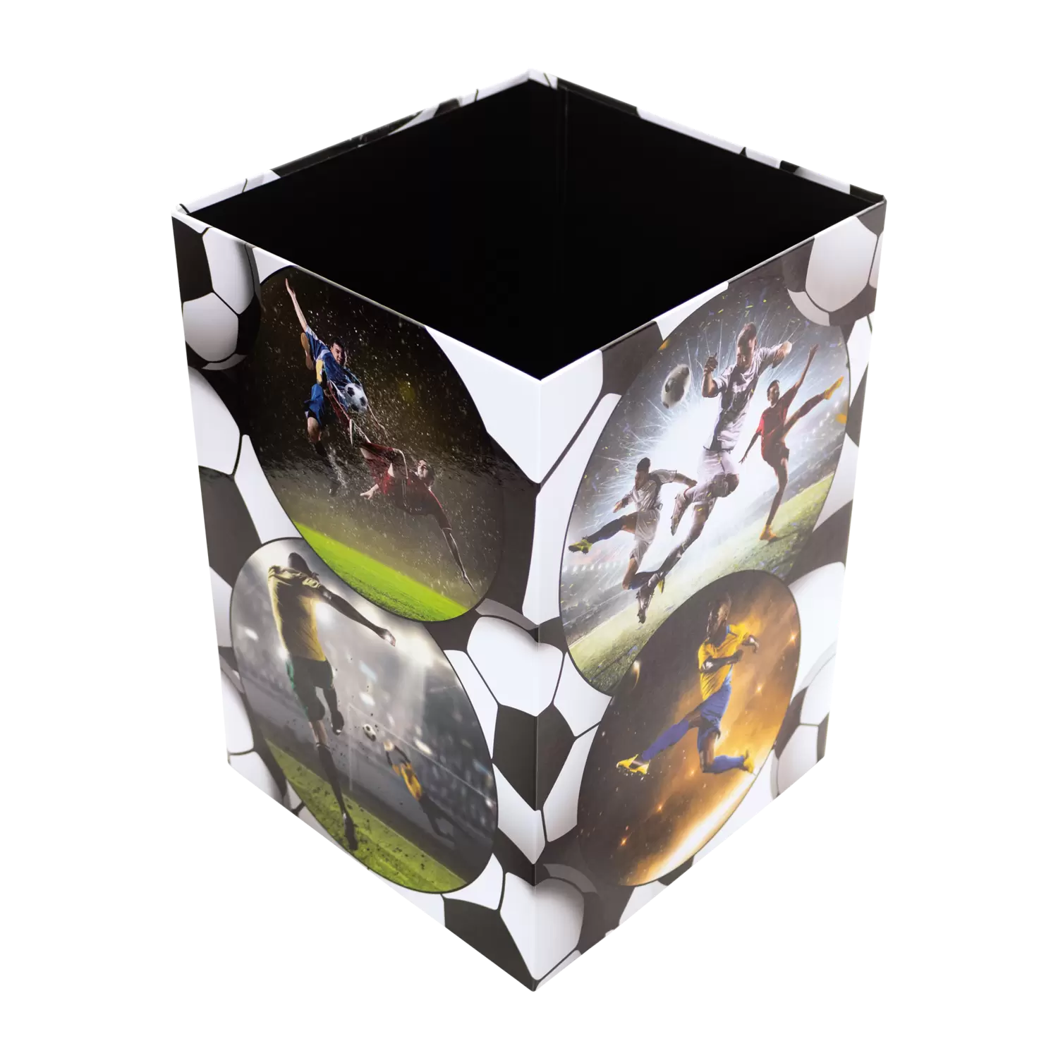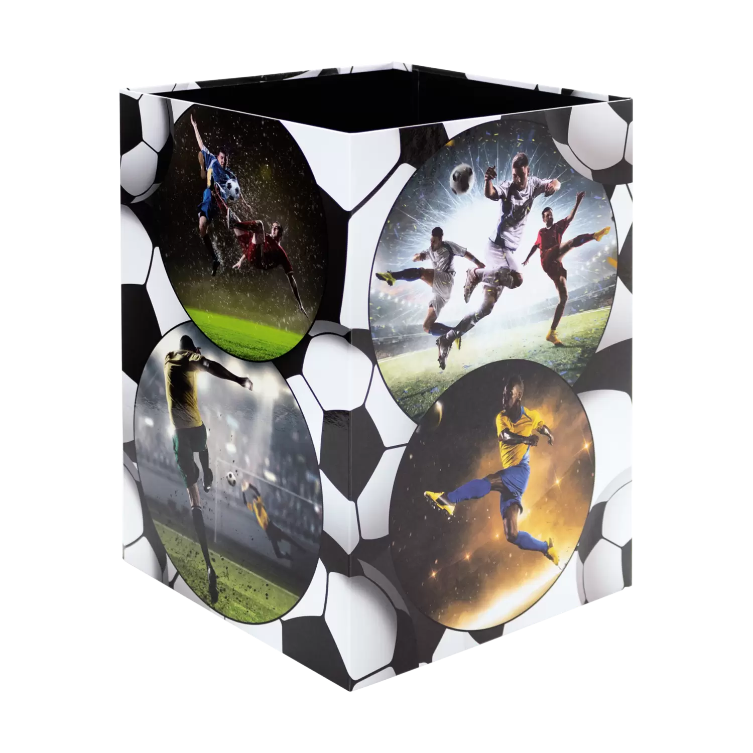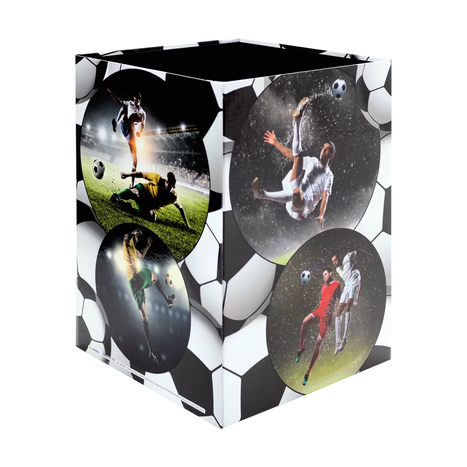 Dieser cool gestaltete Papierkorb ist der Hit für alle Fußball-Fans! Praktisch und schön anzusehen, ein echter Hingucker unter dem Schreibtisch. Der Papierkorb ist aus starkem Karton gefertigt und hat ein Fassungsvermögen von 15 Litern, so passt er unter jeden Schreibtisch. Durch die beschichtete Oberfläche ist er abwischbar und leicht zu reinigen. Ordnung halten leicht gemacht, auch im Kinderzimmer. Mit HERMA. Entdecken Sie die Produkte der beliebten Fußball-Serie: Sammelmappen, Motiv-Ordner, Schreibunterlagen, Sticker und mehr! Cooles Design, beliebt bei Jungen und Mädchen – der Hit im Kinderzimmer.