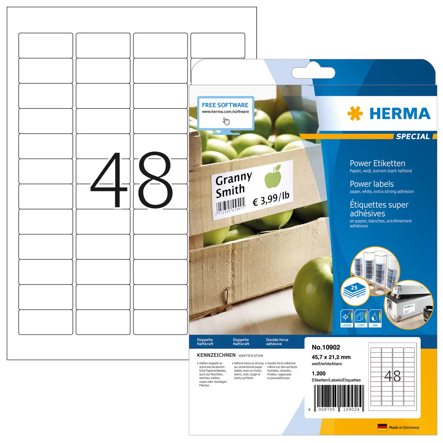Extrem stark haftende Etiketten auf A4-Blättern, selbstklebend. Haften doppelt so stark wie herkömmliche Papieretiketten, auch auf kritischem Untergrund, z. B. feuchten, warmen, kalten, rauen oder staubigen Flächen. Ideal zur sicheren Kennzeichnung von Produkten, Dokumenten und Inventar, für Sicherheits- und Warnhinweise, für Rundbeklebung, als Prüfplakette oder Verschlussetikett, im Innenbereich. Umweltfreundlich: hochwertiges, chlorfrei gebleichtes Spezialpapier, FSC® Mix Credit-zertifiziert, lösemittelfreier Haftkleber. Etiketten sind 100 % recyclingfähig mit dem Altpapier, Verpackung aus Recyclingkarton. Sehr gute Druckergebnisse auf allen Laser- und Inkjetdruckern, Kopierern, Farblaserdruckern und Farbkopierern. Störungsfreie Verarbeitung durch Rundum-Sicherheitskante und optimale Planlage. Kostenlose Softwarelösungen: www.herma.de/software.