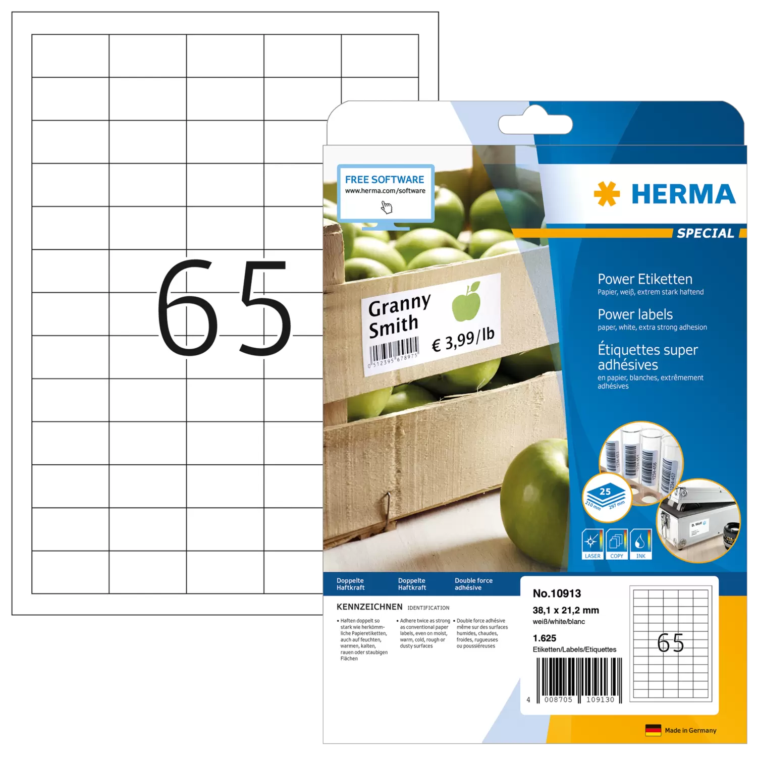 Extrem stark haftende Etiketten auf A4-Blättern, selbstklebend. Haften doppelt so stark wie herkömmliche Papieretiketten, auch auf kritischem Untergrund, z. B. feuchten, warmen, kalten, rauen oder staubigen Flächen. Ideal zur sicheren Kennzeichnung von Produkten, Dokumenten und Inventar, für Sicherheits- und Warnhinweise, für Rundbeklebung, als Prüfplakette oder Verschlussetikett, im Innenbereich. Umweltfreundlich: hochwertiges, chlorfrei gebleichtes Spezialpapier, FSC® Mix Credit-zertifiziert, lösemittelfreier Haftkleber. Etiketten sind 100 % recyclingfähig mit dem Altpapier, Verpackung aus Recyclingkarton. Sehr gute Druckergebnisse auf allen Laser- und Inkjetdruckern, Kopierern, Farblaserdruckern und Farbkopierern. Störungsfreie Verarbeitung durch Rundum-Sicherheitskante und optimale Planlage. Kostenlose Softwarelösungen: www.herma.de/software.