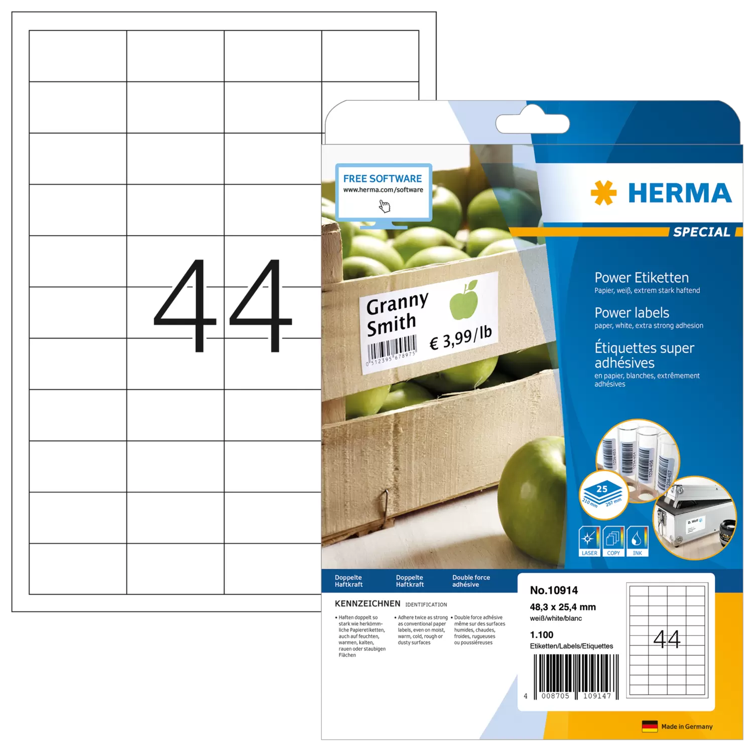 Extrem stark haftende Etiketten auf A4-Blättern, selbstklebend. Haften doppelt so stark wie herkömmliche Papieretiketten, auch auf kritischem Untergrund, z. B. feuchten, warmen, kalten, rauen oder staubigen Flächen. Ideal zur sicheren Kennzeichnung von Produkten, Dokumenten und Inventar, für Sicherheits- und Warnhinweise, für Rundbeklebung, als Prüfplakette oder Verschlussetikett, im Innenbereich. Umweltfreundlich: hochwertiges, chlorfrei gebleichtes Spezialpapier, FSC® Mix Credit-zertifiziert, lösemittelfreier Haftkleber. Etiketten sind 100 % recyclingfähig mit dem Altpapier, Verpackung aus Recyclingkarton. Sehr gute Druckergebnisse auf allen Laser- und Inkjetdruckern, Kopierern, Farblaserdruckern und Farbkopierern. Störungsfreie Verarbeitung durch Rundum-Sicherheitskante und optimale Planlage. Kostenlose Softwarelösungen: www.herma.de/software.