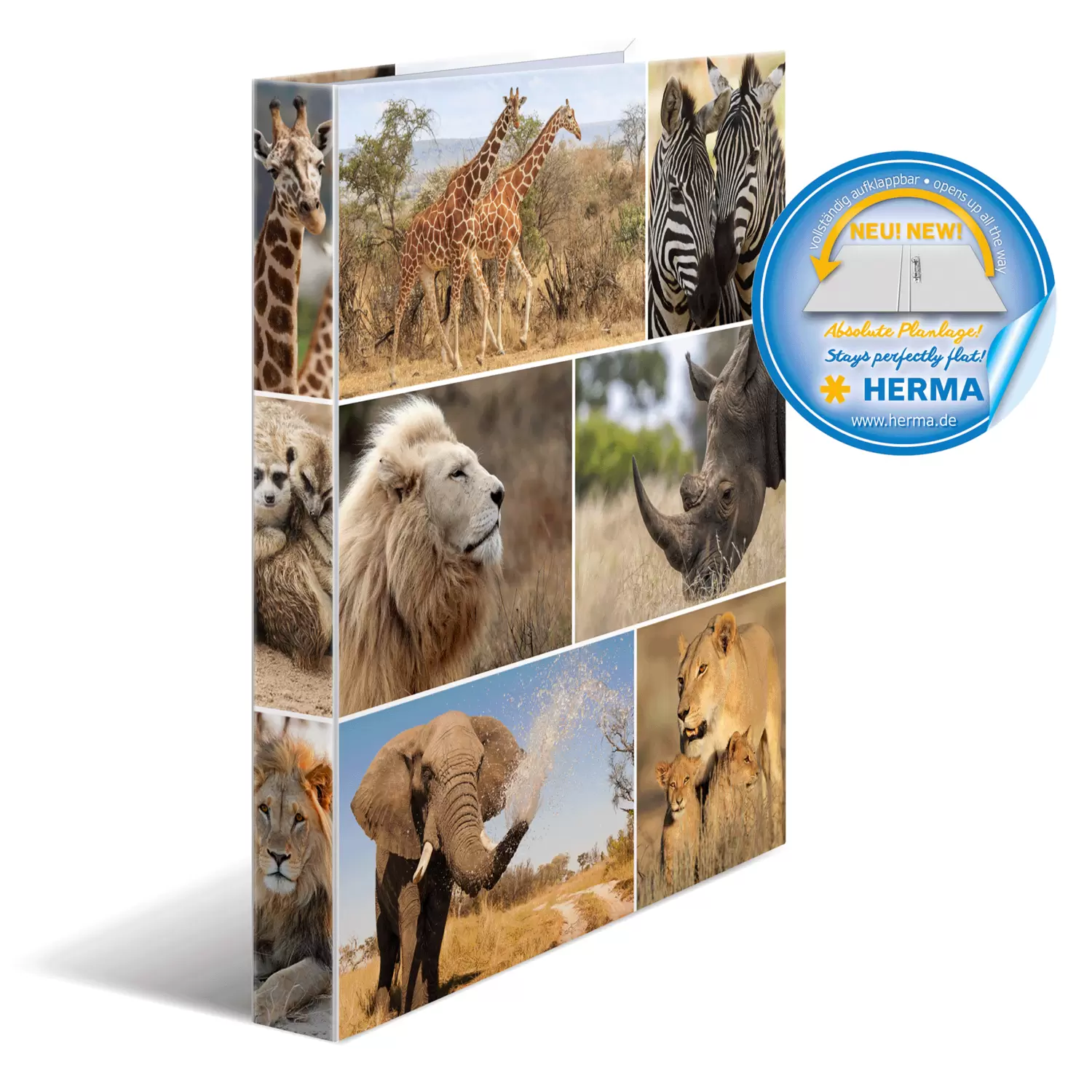 Ordnung muss sein – Spaß aber auch! Wer beschäftigt sich wirklich gerne mit Papierkram? Genau, Niemand. Aber irgendwann müssen Dokumente, Briefe, Abrechnungen und Bescheide nun mal sortiert und abgeheftet werden. Mit den HERMA Ringbüchern im praktischen Format für alle Papiere bis zur Größe Din A4 lassen sich alle Unterlagen ordentlich und übersichtlich aufbewahren. Wird ein Schriftstück für ein Amt, eine Behörde oder die Versicherung benötigt ist alles schnell zur Hand. Und auch für das private Vergnügen sind die Ordner bestens geeignet: zum Sammeln von Rezepten, zur Urlaubsplanung oder als Familienplaner – hier findet alles seinen Platz. Und das beste: mit den tollen Animal-Designs ist die Ordnerserie im Regal ein echter Hingucker. Denn das Auge ordnet ja schließlich mit. Mit dem brandneuen Design Afrika Tiere wird's wild! Das Ringbuch ist mit 16 tollen Tierfotografien gestaltet, mit dabei sind unter anderem Giraffen, Elefanten, Löwen und Erdmännchen. Die praktische 4-Ring-Mechanik und der Niederhalter sorgen für optimalen Halt.