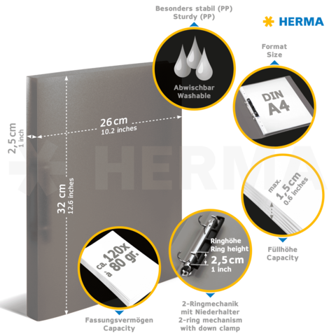 - Innovative 2-D-Ring-Mechanik für leichtes Umschlagen und Abheften, mit praktischem Niederhalter