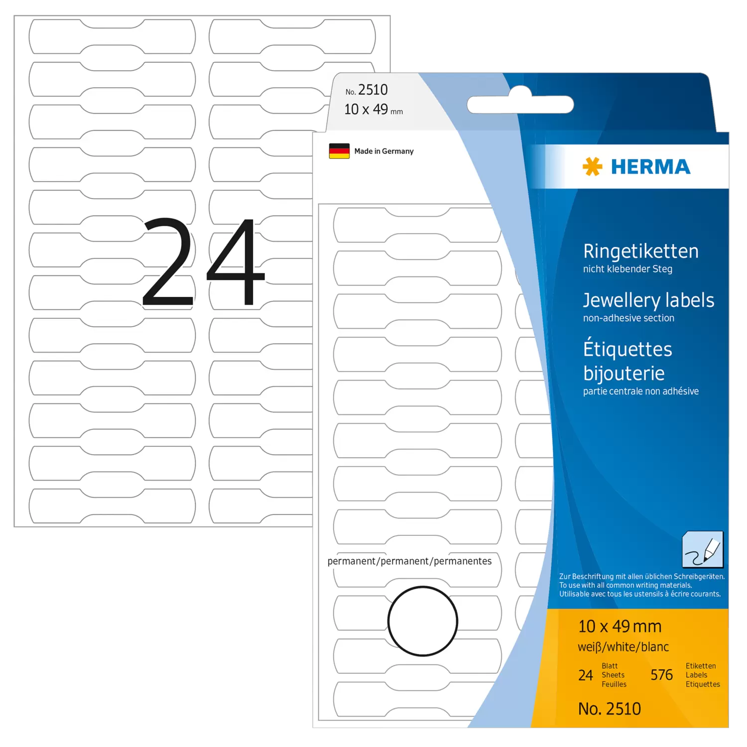 Selbstklebende Ring-Etiketten aus weißem Halbkarton, nicht klebender Mittelsteg. Zum Auszeichnen von Ringen, Uhren, Schmuck, Brillen und Gegenständen mit geringem Durchmesser, z. B. Kabel. Einfach die Klebefl ächen zusammenkleben, fertig. Umweltfreundlich: hochwertiges, chlorfrei gebleichtes Spezialpapier, lösemittelfreier Haftkleber. Blattformat 111 x 170 mm. Zur Handbeschriftung mit allen Schreibgeräten und Schreibmaschinen. Nicht für PC-Beschriftung geeignet, nutzen Sie dafür HERMA Ringetiketten auf A4-Blättern.