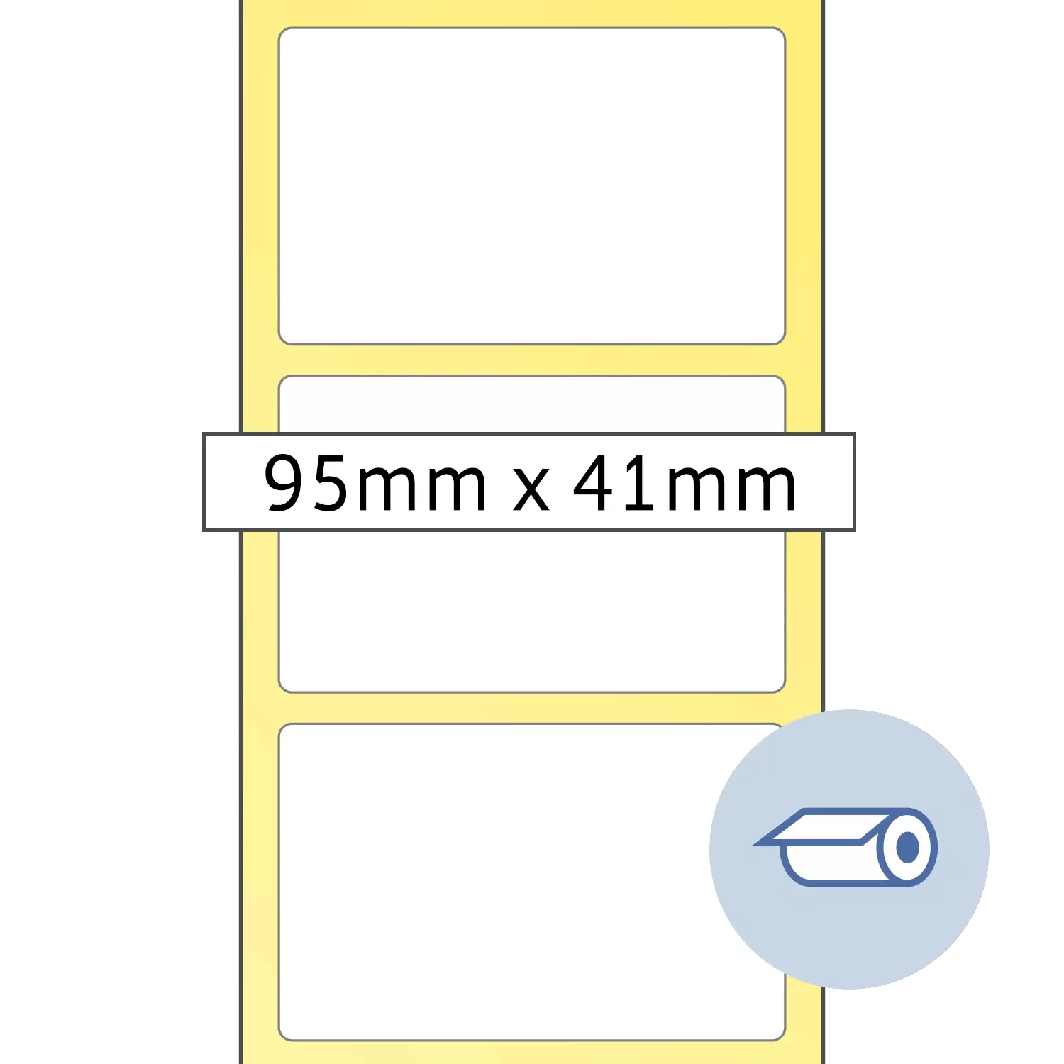 Etiketten 95 x 41 mm auf Rolle, für Thermotransferdrucker und Spendemaschinen. Hochwertiges Papier für konturenscharfe Druckergebnisse im Thermotransferdruck. Universelles Anwendungsgebiet, besonders schnell und sicher haftend auf unterschiedlichsten Oberflächen. Störungsfreier Lauf ohne Selbstspendeeffekt. Etiketten und Trägerpapier aus chlorfrei gebleichtem Zellstoff, lösemittelfreier Haftkleber. 2.000 Etiketten auf 1 Rolle mit 76 mm (3 Zoll) Rollenkern. Markenqualität made in Germany.