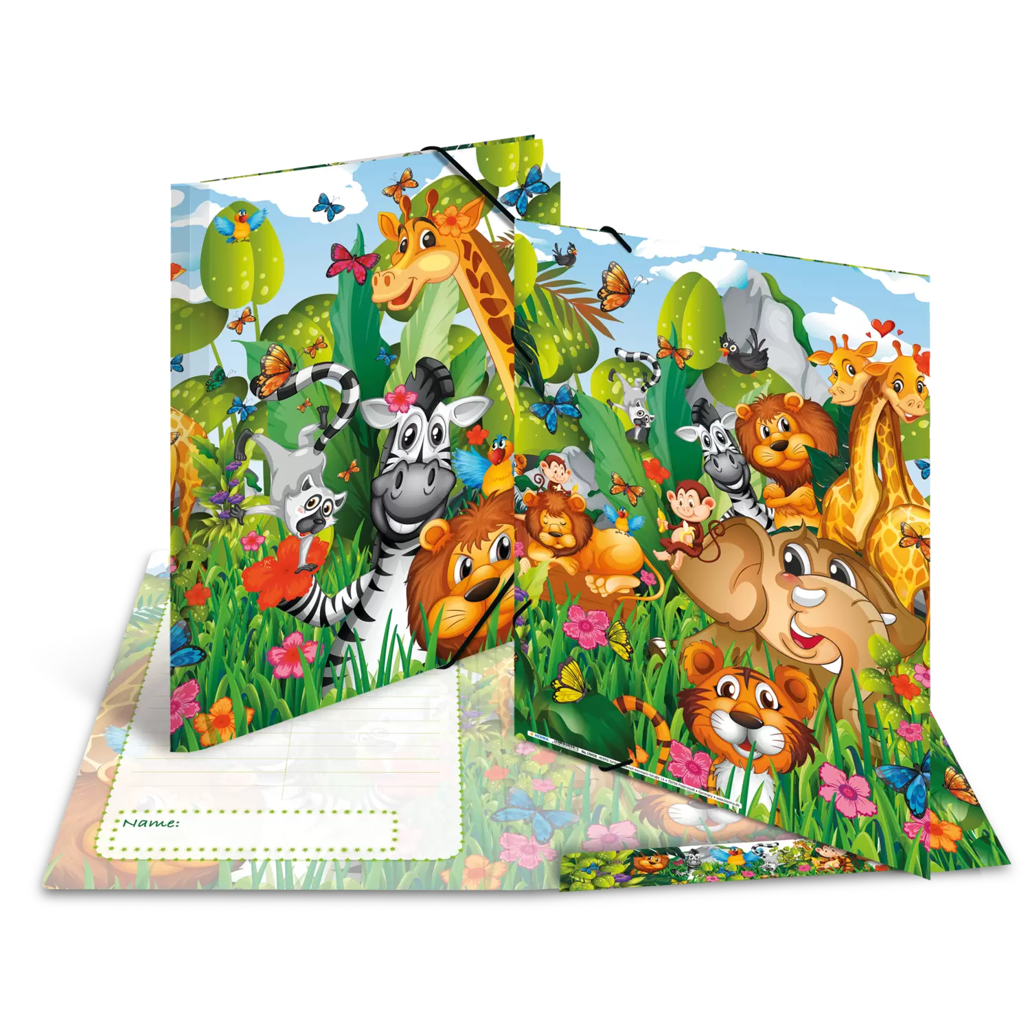 Jetzt wird's wild! Die tierisch gut gestaltete Sammelmappe zeigt verschiedene Dschungelbewohner im farbenfrohen Design. Die Mappe misst 44 cm x 33,5 cm und ist damit groß genug für Papiere, Zeichnungen und Dokumente bis zu einer Größe von DIN A3. Sie ist aus stabilem Karton gefertigt und lässt sich durch zwei hochwertige Eckspanner einfach öffnen und verschließen. Durch die drei Innenklappen wird der Inhalt geschützt und auch kleinere Schriftstücke können nicht herausfallen.