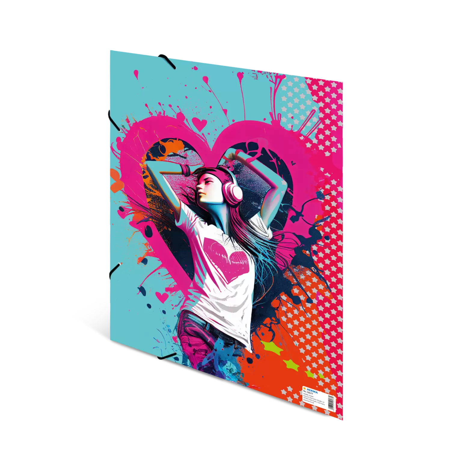 Musik macht das Leben bunter! Mit ihrem knallig bunten und leuchtenden Design "Music Girl" ist diese Sammelmappe ein echter Blickfang, der sofort gute Laune verbreitet. Praktisch und robust - das ist Qualität von HERMA. Die Mappe misst 44 cm x 33,5 cm und ist damit groß genug für Papiere, Zeichnungen und Dokumente bis zu einer Größe von DIN A3. Sie ist aus stabilem Karton gefertigt und lässt sich durch zwei hochwertige Eckspanner einfach öffnen und verschließen. Durch die drei Innenklappen wird der Inhalt geschützt und auch kleinere Schriftstücke können nicht herausfallen.