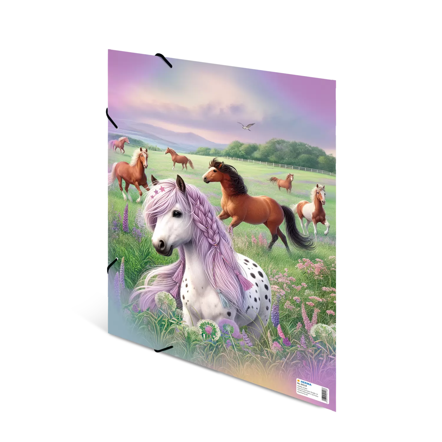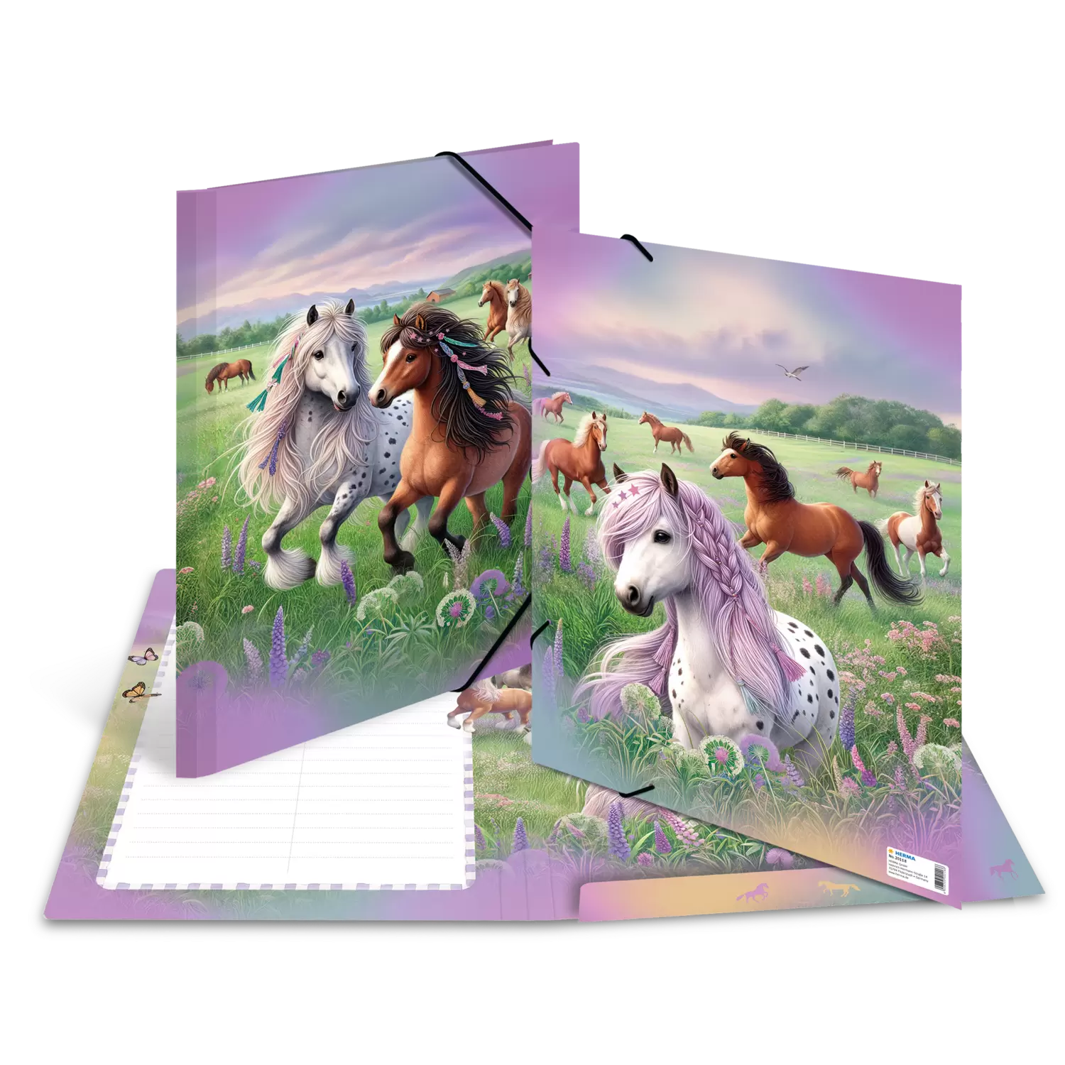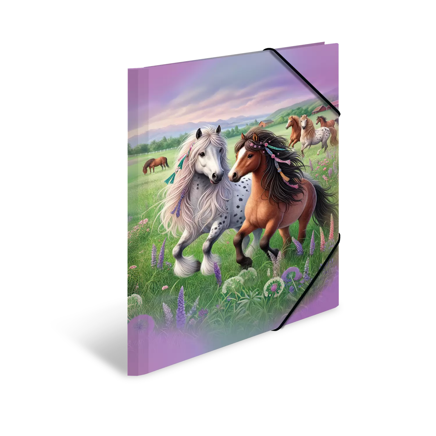 Die Sammelmappe "Pferdewelt" entführt in eine zauberhaft schöne Landschaft, die die Herzen von Pferdefans höher schlagen lässt. Die liebevollen Zeichnungen zeigen verspielte Pferde mit wallenden Mähnen, in die Zöpfe, Perlen und bunte Bänder eingeflochten sind. Auf einer blühenden Wiese tummeln sich mehrere dieser schönen Tiere, umgeben von lila Blumen, die dem Bild eine romantische Note verleihen. Der sanfte, zartlila Himmel schafft eine harmonische Atmosphäre und lädt zum Träumen ein. Diese Sammelmappe für das Format DIN A3 vereint Funktionalität mit einem ansprechenden Design und ist ideal für die Aufbewahrung von Schulunterlagen, kreativen Projekten oder persönlichen Erinnerungen. Die liebevolle Gestaltung strahlt Unbeschwertheit aus und vermittelt das Gefühl von Freiheit und Ruhe. Die Sammelmappe "Pferdewelt" bringt Freude in den Alltag und ist perfekt für alle, die die ländliche Idylle und die Liebe zu Pferden schätzen. Ein stilvolles Accessoire für kleine und große Pferdefans, das die Leidenschaft für diese fantastischen Tiere auf besondere Weise festhält.