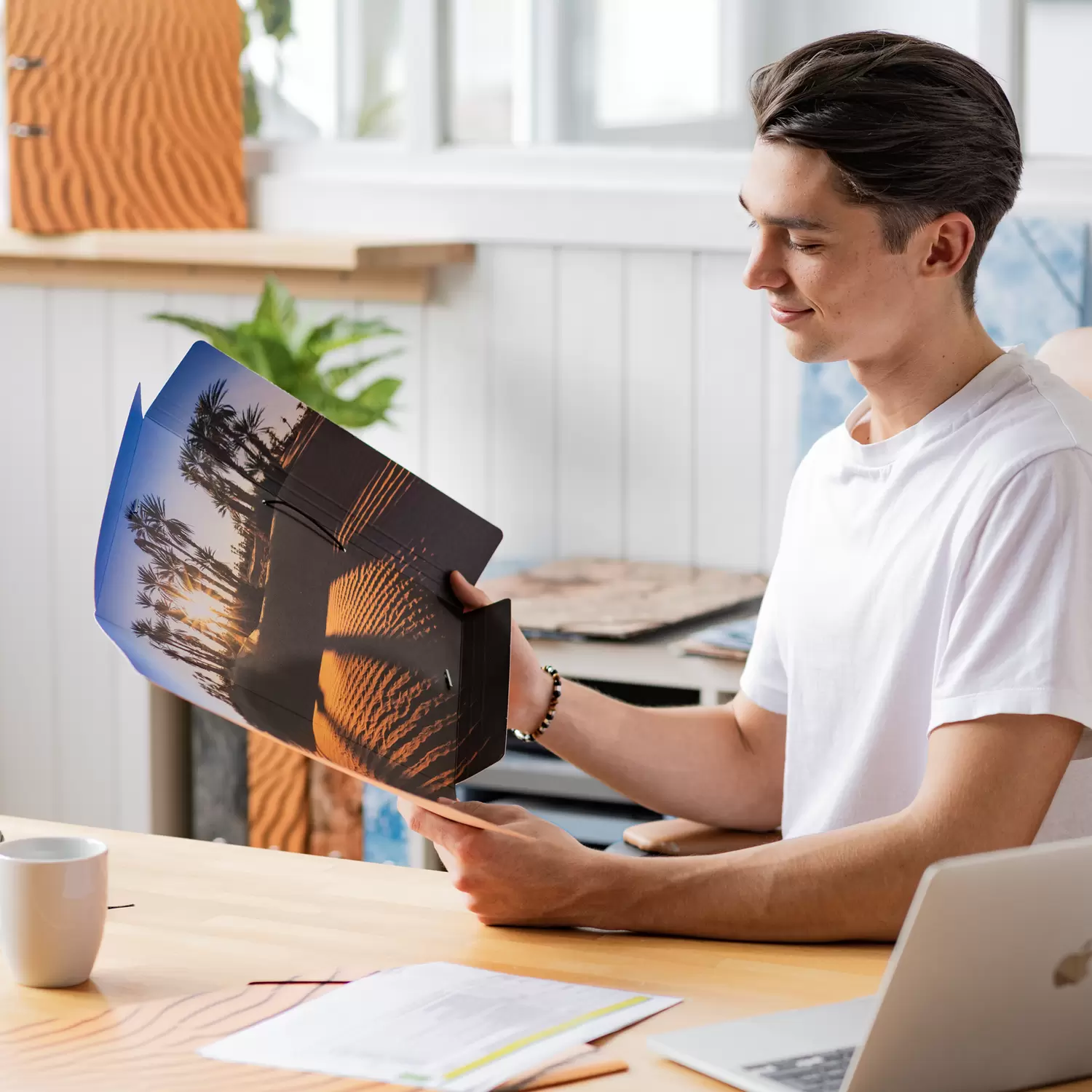 • Geeignet für Formate bis DIN A3, aus stabilem Karton, mit Gummi-Eckspannern und 3 bedruckten Innenklappen