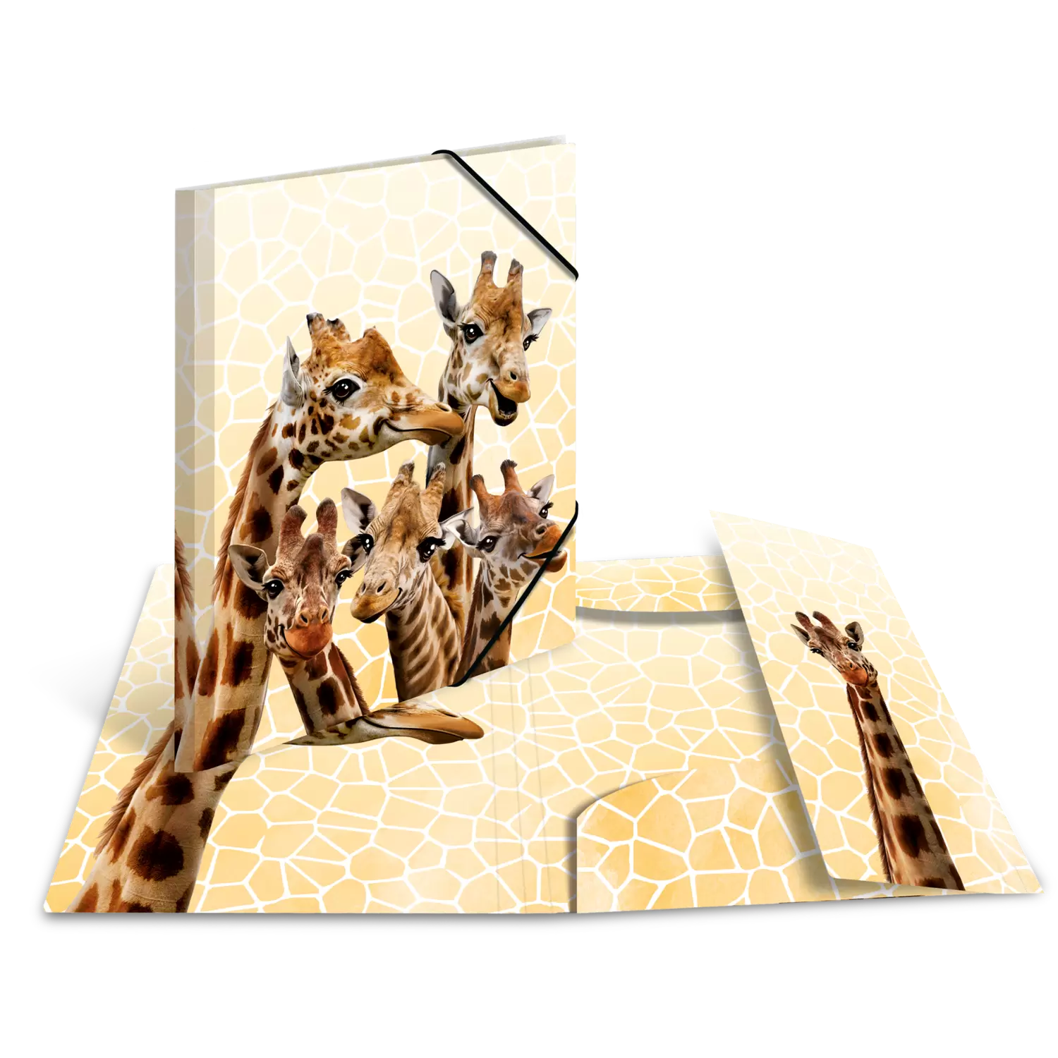 Die Tiermotiv-Sammelmappe Giraffenfreunde von HERMA, mit farbigem Innendruck ist bestens geeignet für alle Tierliebhaber, die Ordnung und Optik miteinander verbinden möchten. Die Sammelmappe verfügt über einen schlichten Hintergrund mit Fellzeichnung, sodass die Giraffen mit ihren schönen Augen und den langen Wimpern als wahre Eyecatcher im Vordergrund stehen. Die Sammelmappe gehört mit 4 weiteren tierischen Motiven zur Exotischen Tierweltserie, die garantiert für gute Laune sorgt und alles bietet, was Schülerinnen, Schüler, Studentinnen und Studenten benötigen, um wichtige Unterlagen und Kunstwerke leicht und schnell zu verstauen. Ausgestattet mit qualitativ hochwertigen Eckspannern, hält sie den Inhalt so zusammenhalten, dass er nicht herausfallen und verloren gehen kann. Auch sind Papiere vor Schmutz, Dreck und anderen Außeneinflüssen optimal geschützt, da die Sammelmappe von HERMA über drei integrierte Innenklappen verfügt. Zudem ist sie äußerst strapazierfähig und abwischbar. Aus stabilem Polypropylen hergestellt, trägt die Mappe der Ordnung bei und verleiht Überblick über verschiedenstes Schriftgut. Aufgrund der Größe kann die Sammelmappe leicht vom Arbeitsplatz oder der Schule nach Hause transportiert werden, sie passt problemlos in den Rucksack, in die Schul- oder Aktentasche. Weitere Motive der Serie sind die Koala Familie, die Tropenclique, die Affenbande und die Erdmännchen Truppe. Sie hat das Format 320 mm x 240 mm, sodass Bilder, Unterlagen und Zeichnungen bis zu einer Größe von Din A4 ordentlich aufbewahrt werden können. Das Besondere an den Mappen sind die bedruckten Innenseiten mit zur Außenseite passendem Motiv. Für größere Kunstwerke und Unterlagen gibt es das Sortiment auch im Format DIN A3 mit den gleichen Motiven.