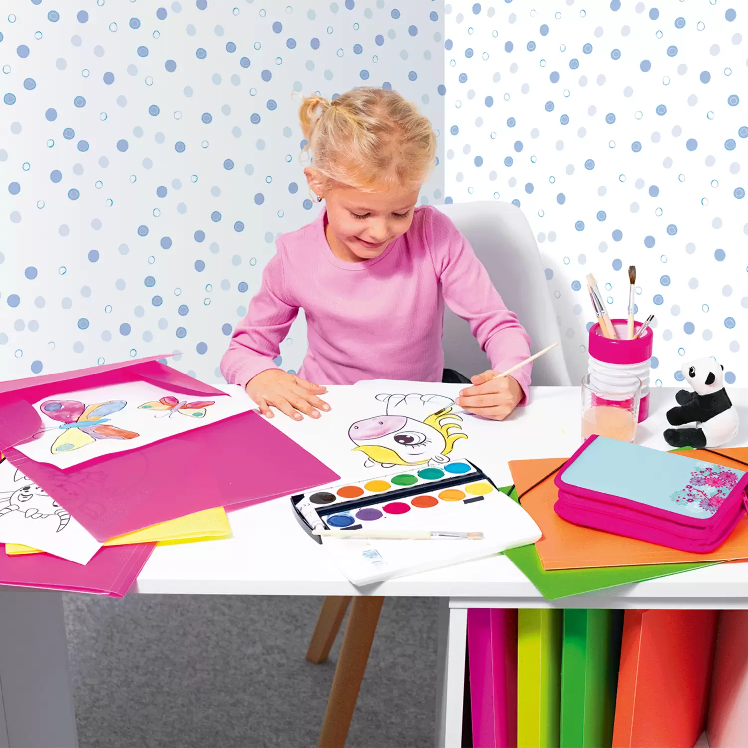 Schluss mit dem Papierchaos! Mit den neuen Sammelmappen "Neon" von HERMA bringen Sie Ordnung in Ihre Unterlagen. Die knallig auffällige Gummizugmappe in der Farbe strahlendem Orange ist ideal für Schüler und Studenten, aber auch zu Hause einfach praktisch. Die Ordnungsmappe aus stabilem Polypropylen, misst 32 cm x 24 cm und ist damit groß genug für Entwürfe, Skizzen, Fotografien, Papiere, Zeichnungen und Dokumente bis zu einer Größe von DIN A4. Sie ist mit hochwertigen Eckspannern ausgestattet, die den Inhalt so zusammenhalten, dass er nicht herausfallen kann. Auch sind Papiere vor Schmutz, Dreck und anderen Außeneinflüssen optimal geschützt, da die Mappe über drei integrierte Innenklappen verfügt.