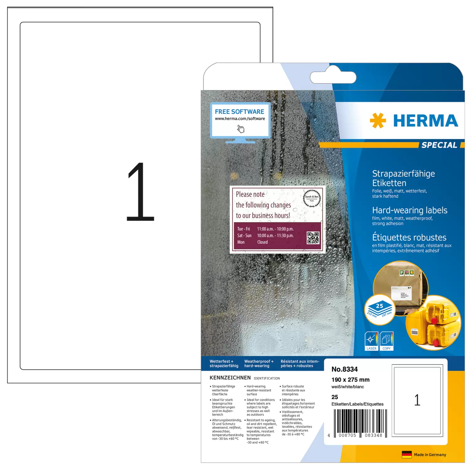 Strapazierfähige Schilder aus weißer Polyesterfolie, auf A4-Blättern, besonders stark haftend. Ideal für individuell gestaltete Hinweis- und Warnschilder, Schaufensteraufkleber oder stark beanspruchte Etikettierungen. Strapazierfähige wetterfeste Oberfläche, besonders stark haftend, UV- und alterungsbeständig, Öl und Schmutz abweisend, abwaschbar, temperaturbeständig von -30 bis +80 °C, seewasserfest. Störungsfreie Verarbeitung durch Rundum-Sicherheitskante und optimale Planlage. Für Laserdrucker und Kopierer, Farblaserdrucker und Farbkopierer. Nicht für Inkjetdrucker geeignet. Kostenlose Softwarelösungen: www.herma.de/software.