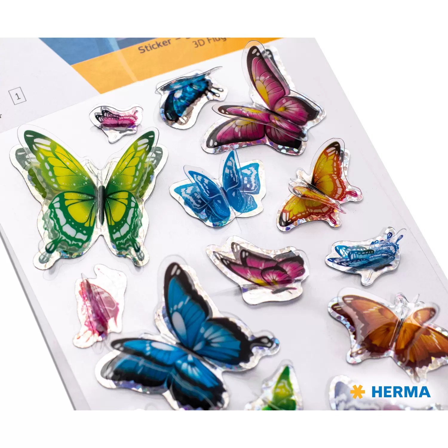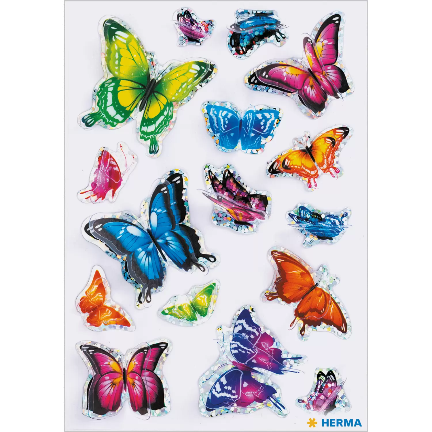 Die bunten und verspielten Sticker "Schmetterling" von HERMA sind ein absolutes Highlight. Mit ihren bunten 3D-Flügeln wirken sie besonders echt und begeistern so garantiert nicht nur kleine Schmetterlings-Fans. Diese effektvollen Sticker sind ideal für das verschönern von Geschenken, Einladungen oder Briefen geeignet. Natürlich lassen sich damit auch selbstgemachte Basteleien, langweilige Aufbewahrungsboxen oder Kalender dekorieren und zu etwas ganz Besonderem machen. Außerdem eignen sich die farbenfrohen Aufkleber "Schmetterling" von HERMA perfekt zum Sammeln und Verschenken. Auch in Freundschaftsalben sind sie ein absoluter Hingucker. Die Aufkleber sind aus hochwertiger Folie, selbstklebend und permanent haftend. Auf einem Stickerbogen befinden sich 16 unterschiedliche Motive.