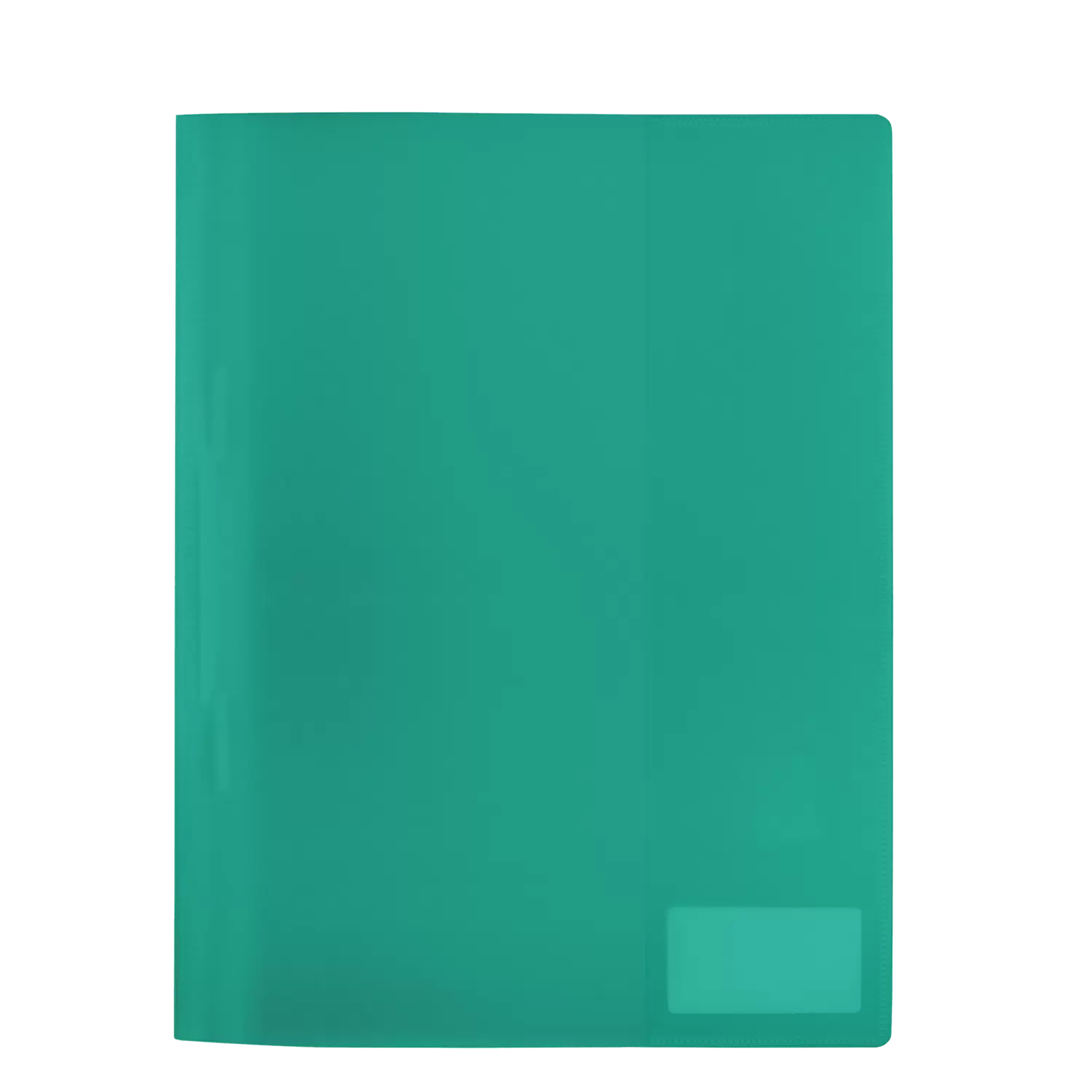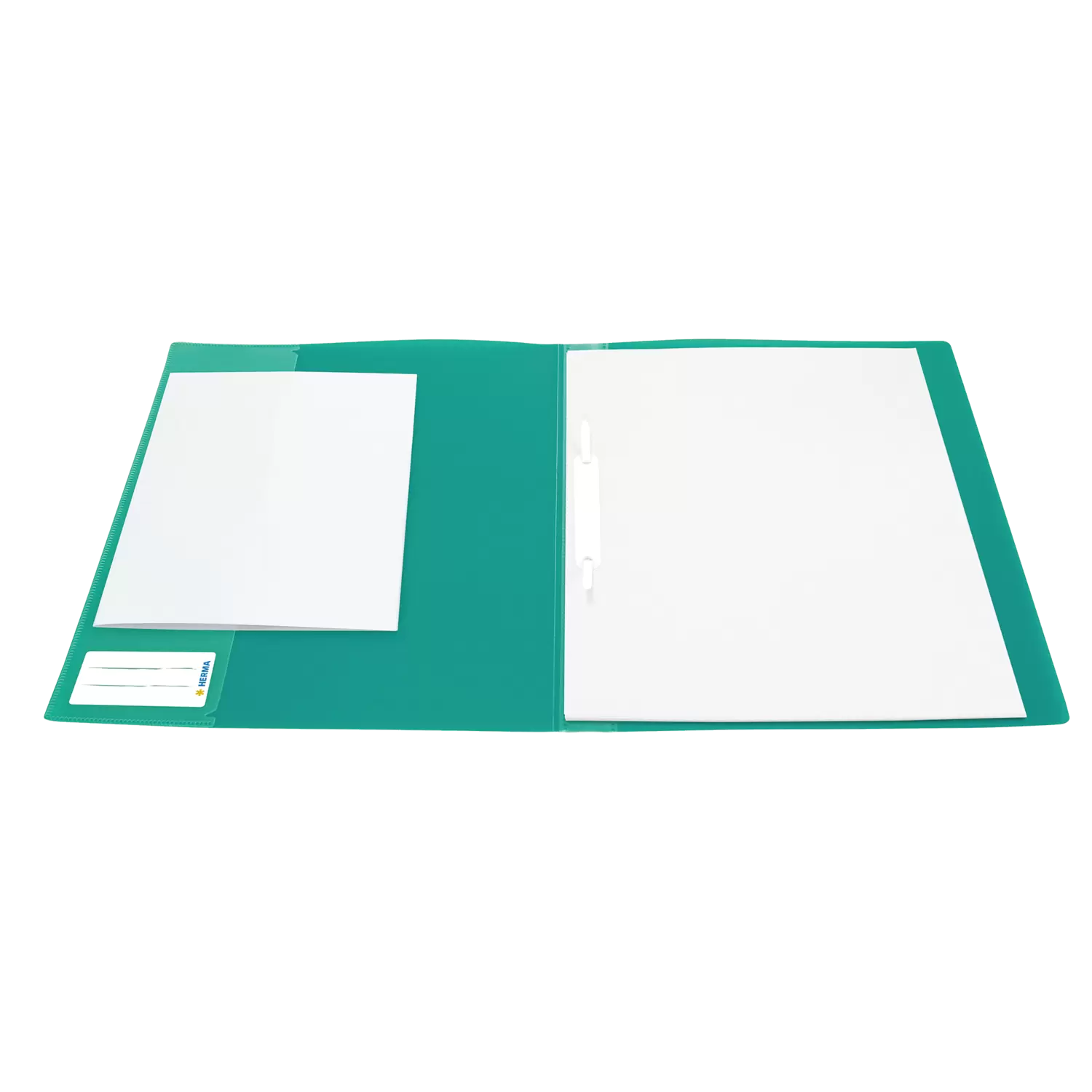 • Schnellhefter für A4 aus umweltfreundlicher, starker transluzenter Polypropylen-Folie mit Metallheftzunge, in 14 Farben, mit Beschriftungsetikett und Einstecktasche