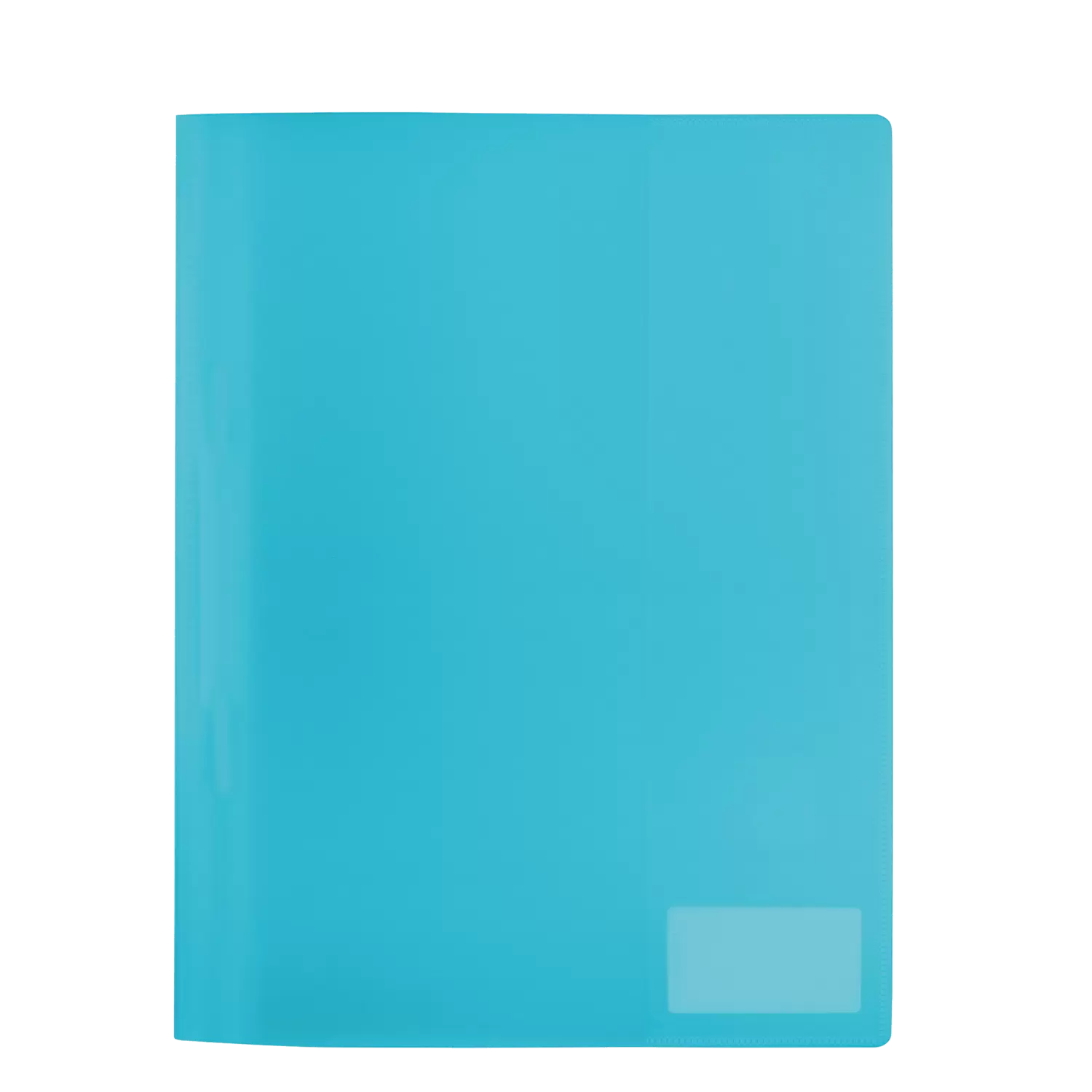 • Schnellhefter für A4 aus umweltfreundlicher, starker transluzenter Polypropylen-Folie mit Metallheftzunge, in 14 Farben, mit Beschriftungsetikett und Einstecktasche