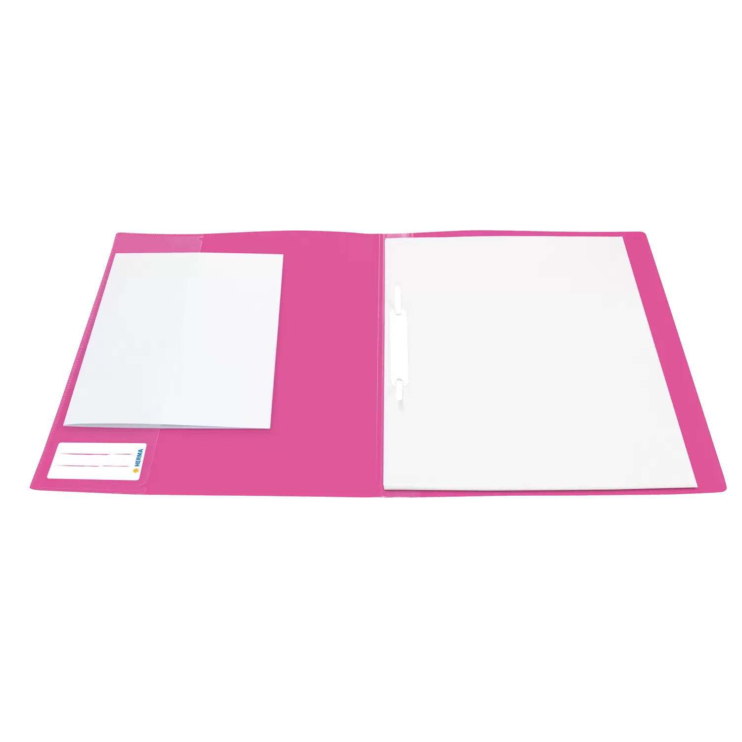 Ordnung war noch nie Ihre Stärke? Mit dem transluzenten Schnellhefter mit Einstecktasche und Etikett wird Organisation plötzlich ganz leicht. Der Hefter in rosa klammert alle wichtigen Unterlagen mit der Metallzunge zuverlässig zusammen, sodass persönliche Dokumente, Arbeitsblätter oder Aufschriebe aus dem Büro, sicher zusammengehalten werden. Durch die sichere Hülle aus Polypropylen sind die Blätter ausreichend geschützt und der Kunststoff tut auch bei schlechtesten Wetterbedingungen seinen Dienst. Dank des durchsichtigen Materials ist direkt einsehbar, welche Dokumente im Schnellhefter eingeheftet sind und durch das bereits aufgebrachte Beschriftungsetikett können ganz leicht zusätzlich auch noch weitere Informationen zum Inhalt oder zum Eigentümer dieses Hefters vermerkt werden. Besonders praktisch wird der Schnellhefter in den Situationen, in denen einmal kein Locher griffbereit ist, denn mit der großen Einstecktasche, die sich auf der Innenseite des Hefterumschlags befindet, können sofort auch Blätter ohne Lochung sicher und knickfrei abgelegt werden. Das Material ist leicht und der gesamte Hefter ist sehr schmal, weshalb er einfach überall hin transportiert werden kann. Ob zur Schule, Uni oder Arbeit, in diesem Hefter in pink sind alle wichtigen Unterlagen mit einem DIN A4 Format bestens untergebracht.