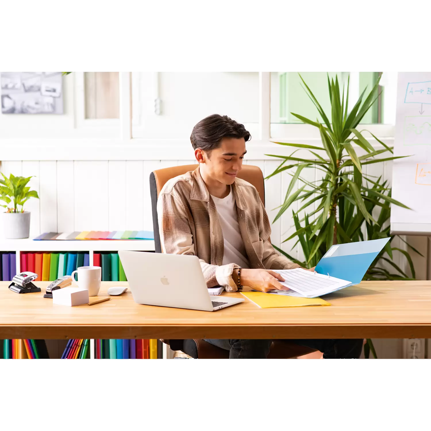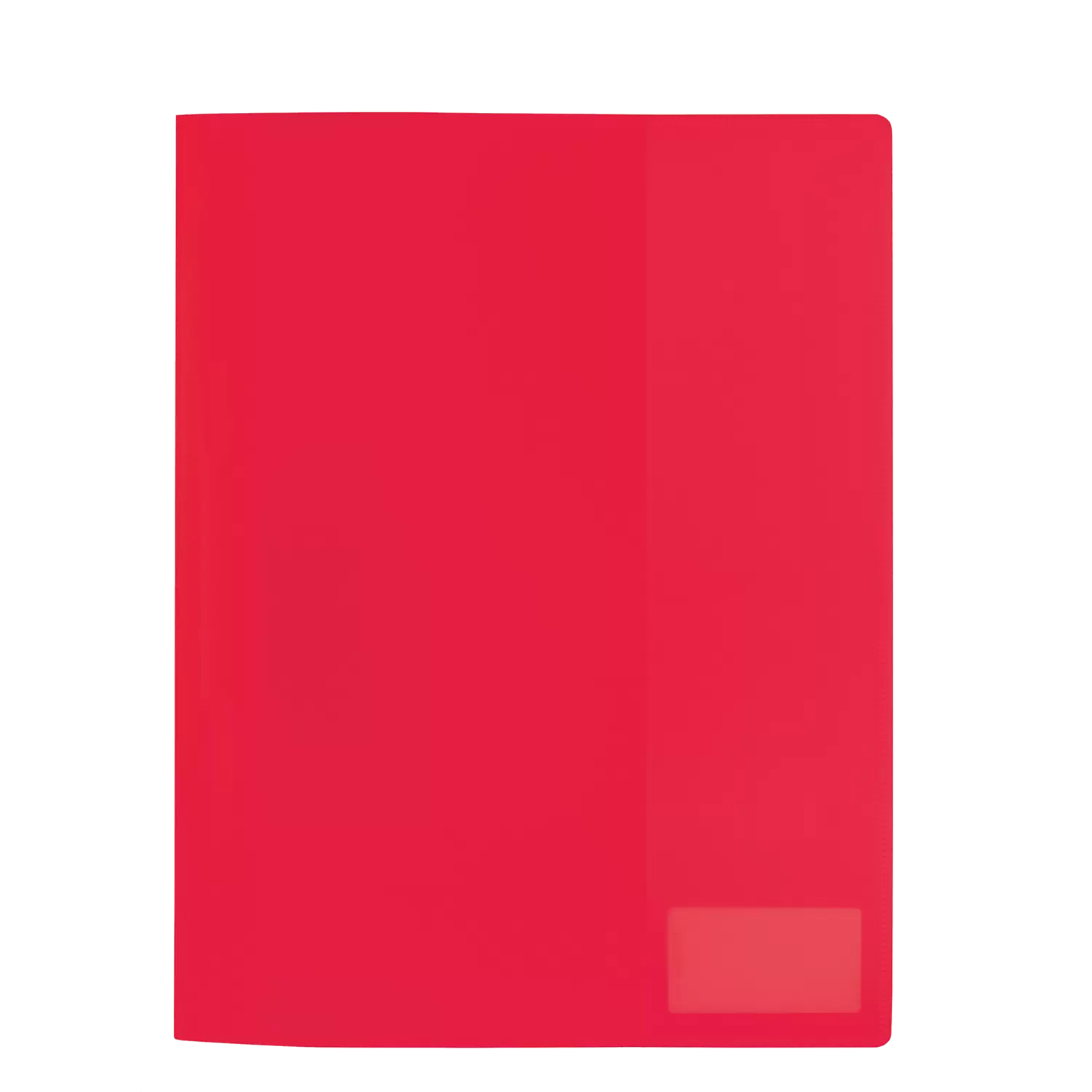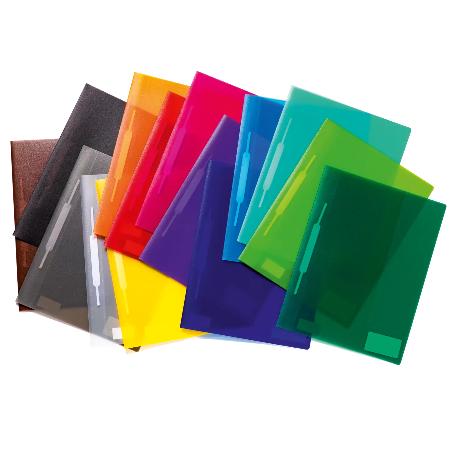 • Schnellhefter für A4 aus umweltfreundlicher, starker transluzenter Polypropylen-Folie mit Metallheftzunge, in 14 Farben, mit Beschriftungsetikett und Einstecktasche