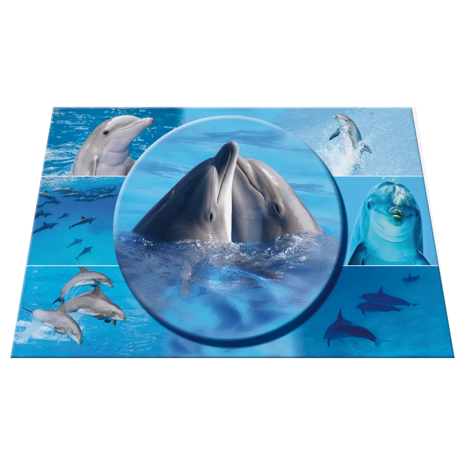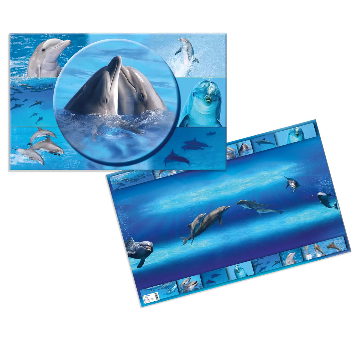 • Farbenfrohe Schreibunterlage mit schelmisch lächelnden Delfinen und Softtouch-Oberfläche