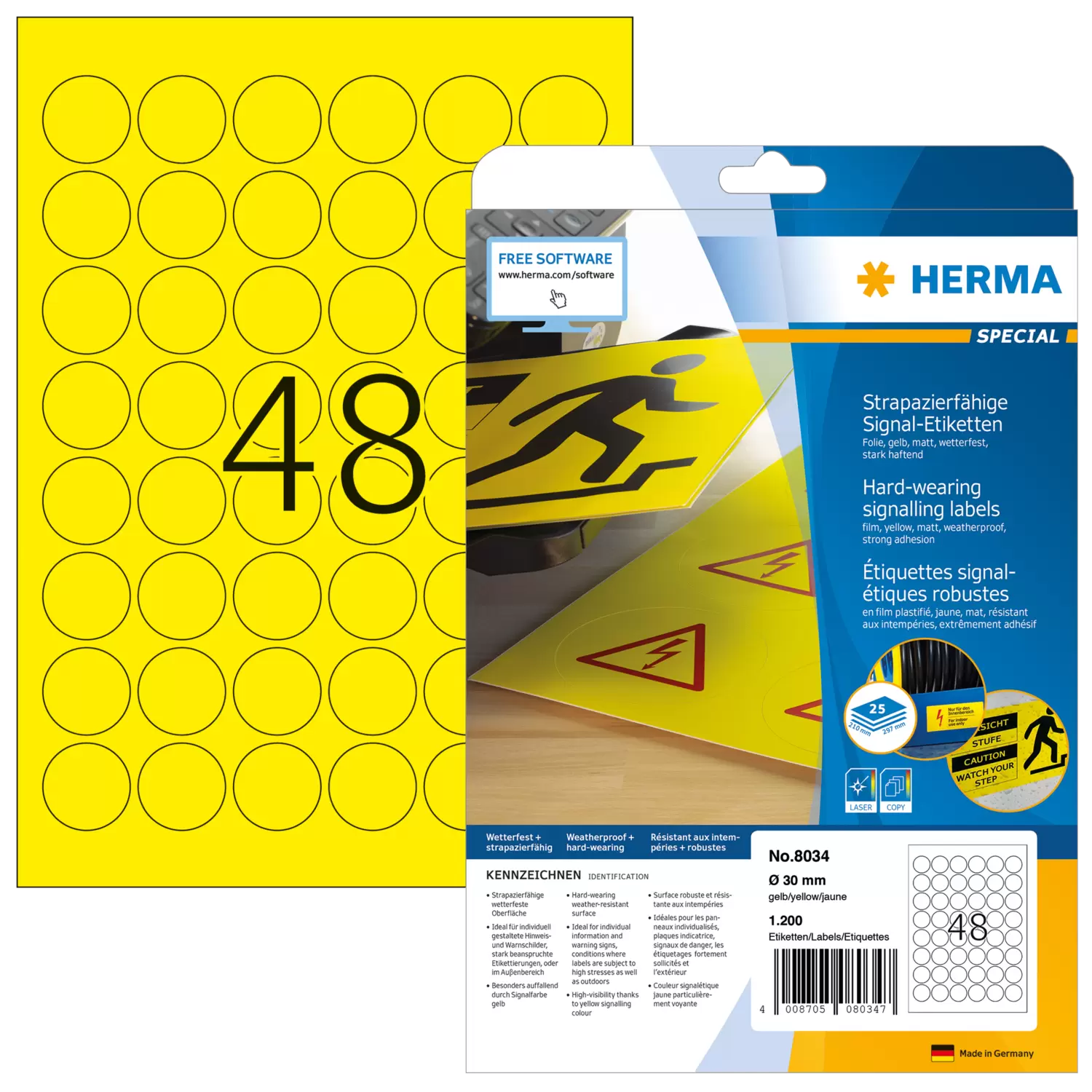 Gelbe Folien-Etiketten auf A4-Blättern, selbstklebend. Ideal für stark beanspruchte Etikettierungen und im Außenbereich: Eigentumsetiketten, Hinweis- und Warnschilder, Kennzeichnungen in Lager und Produktion. Besonders auffallend durch Signalfarbe gelb. Strapazierfähige wetterfeste Oberfläche, besonders stark haftend, UV- und alterungsbeständig, Öl und Schmutz abweisend, abwaschbar, temperaturbeständig von -30 bis +80 °C, seewasserfest. Störungsfreie Verarbeitung durch Rundum-Sicherheitskante und optimale Planlage. Für Laserdrucker und Kopierer, Farblaserdrucker und Farbkopierer. Nicht für Inkjetdrucker geeignet. Kostenlose Softwarelösungen: www.herma.de/software.