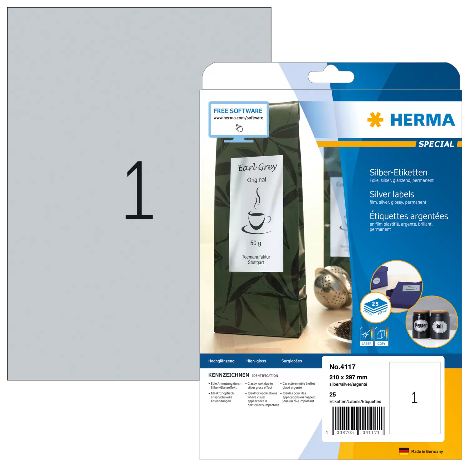 Silberfarbene Etiketten aus glänzender Polyesterfolie, auf A4-Blättern, selbstklebend. Exklusiv und glänzend, für Jubiläums- und Festetiketten, individuelle Geschenke, ausdruckstarke Präsentationen, repräsentative Produktaufkleber. Wasserfest und Schmutz abweisend, sicher haftend auf allen Oberflächen. Störungsfreie Verarbeitung durch Rundum-Sicherheitskante und optimale Planlage. Für Laserdrucker und Kopierer, Farblaserdrucker und Farbkopierer. Nicht für Inkjetdrucker geeignet. Kostenlose Softwarelösungen: www.herma.de/software.