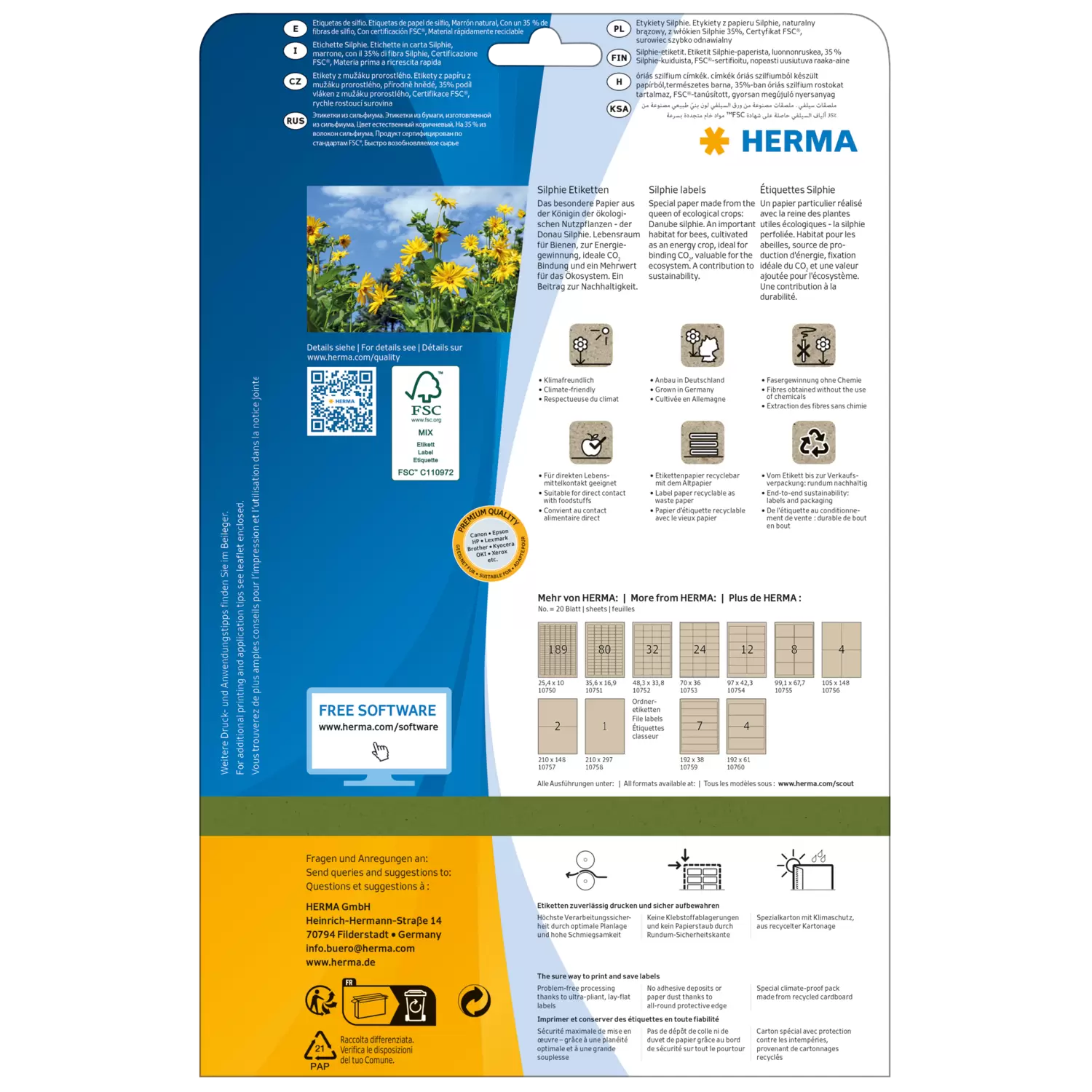 Das besondere Papier aus der Königin der ökologischen Nutzpflanzen - der Donau Silphie. Lebensraum für Bienen, zur Energiegewinnung, ideale CO2 Bindung und ein Mehrwert für das Ökosystem. Ein Beitrag zur Nachhaltigkeit. FSC® Mix Credit-zertifiziert. Anbau in Deutschland, kurze Transportwege, weniger CO2-Ausstoß. Moderner Kraftpapier-Look, aus mindestens 35% Silphie-Fasern. (Schwankungen im Farbton möglich, da umweltfreundlicher Rohstoff). Für direkten Lebensmittelkontakt geeignet. Etikettenpapier recyclebar mit dem Altpapier. Vom Etikett bis zur Verkaufsverpackung: rundum nachhaltig. Sehr gute Druckergebnisse auf allen Laser- und Inkjetdruckern, Kopierern, Farblaserdruckern und Farbkopierern. Kostenlose Softwarelösungen: www.herma.de/buero-zuhause/vorlagen-software.