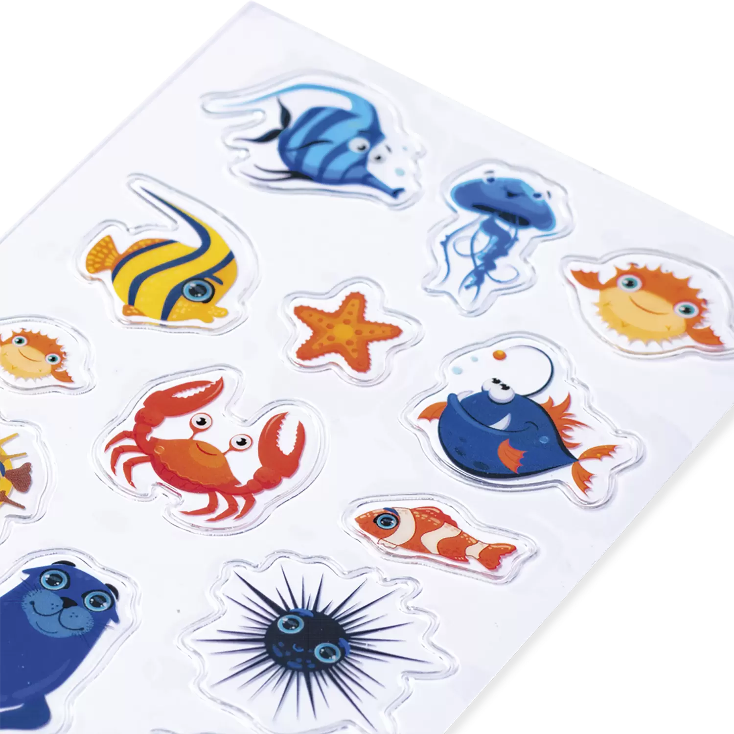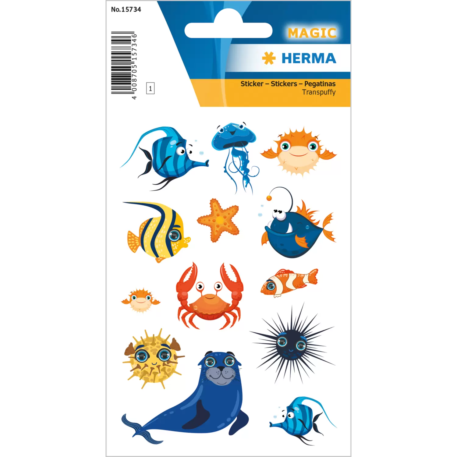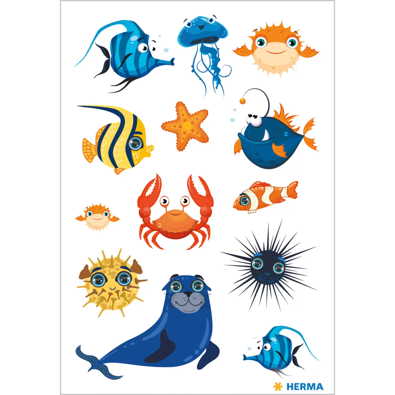Im großen weiten Meer, da tummeln sich so einige Gesellen. Farbenfrohe Fische, Krabben, Quallen und ihre Freunde! Diese wunderschön gestalteten Sticker aus robuster Transpuffy-Folie mit Unterwassermotiven eignen sich perfekt zum Verschönern und Dekorieren. Die Sticker sind permanent haftend und selbstklebend auf fast allen Oberflächen. Sie lassen sich ganz einfach abziehen und beliebig aufkleben. Ideal als Verzierung für Hefte, Ordner und Mappen, zum Basteln oder zum Sammeln und Tauschen.