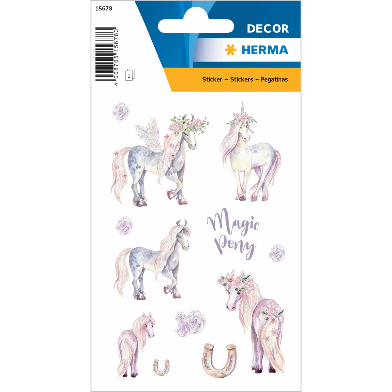 Diese niedlichen HERMA Aufkleber sind bestens geeignet, um wahren Pferde-Fans ein Strahlen ins Gesicht zu zaubern. In besonders kinderfreundlichem Design sind die süßen, glimmernden Ponys und weiteren Accessoires bei Bastel-Aktionen mit den Eltern oder im Kindergarten eine optimale Wahl. Ob als Dekoration im Kinderzimmer, als Verzierung auf dem selbstgemalten Kunstwerk oder einfach als persönlicher Touch auf diversen Gegenständen wie Büchern, Freundschaftsbüchern, Fotoalben oder Einladungen und Grußkarten - der Kreativität sind mit den DECOR Stickern keine Grenzen gesetzt. Sie bestehen aus hochwertigem Papier, sind permanent haftend und finden schnell Verwendung. Mit den Stickern können Sie zahlreiche, unterschiedliche Gegenstände ganz nach Ihrem Geschmack verschönern und verzieren. Beachten Sie, dass die zu beklebenden Flächen glatt und fettfrei sind, damit der selbstklebende Aufkleber gut haften kann und nicht verrutscht oder abfällt. Auf 2 Blättern sind insgesamt 24 Kindersticker im Pony-Look in unterschiedlichen Größen enthalten. Sie sorgen für jede Menge Bastelspaß vor allem im Kindergarten, aber auch zu Hause, regen die Kreativität an und dienen als herrliches Hobby, auch außerhalb des Kindergartens. Passend zu den Stickern bietet HERMA Hefte für Aufkleber an, die den Überblick wahren. In jedem Fall sind die Sticker für Ihre Kinder eine ausgezeichnete Wahl, um mit ihren Freunden zu spielen, sie zu sammeln und zu tauschen.