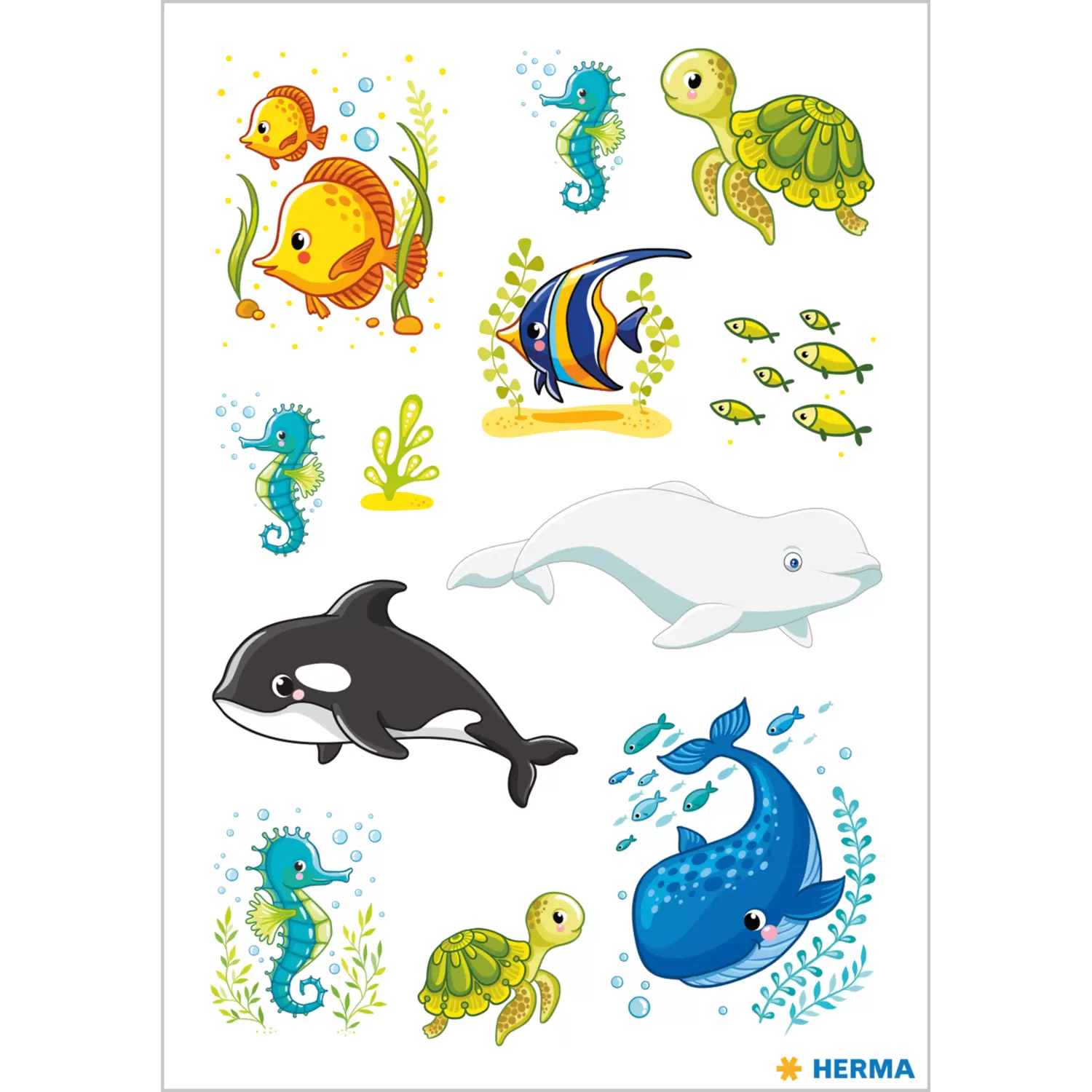 Im großen weiten Meer, da tummeln sich so einige Gesellen. Farbenfrohe Fische, Schildkröten, Seepferdchen und die singenden Giganten der Tiefe: die Wale! Diese wunderschön gestalteten Sticker mit Unterwassermotiven eignen sich perfekt zum Verschönern und Dekorieren. In jeder Packung sind 3 Blatt Sticker mit jeweils 12 Stickern enthalten. Die Sticker bestehen aus hochwertigem Papier, sind permanent haftend und selbstklebend auf fast allen Oberflächen. Sie lassen sich ganz einfach abziehen und beliebig aufkleben. Ideal als Verzierung für Hefte, Ordner und Mappen, zum Basteln oder zum Sammeln und Tauschen.