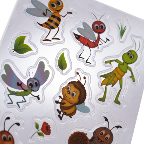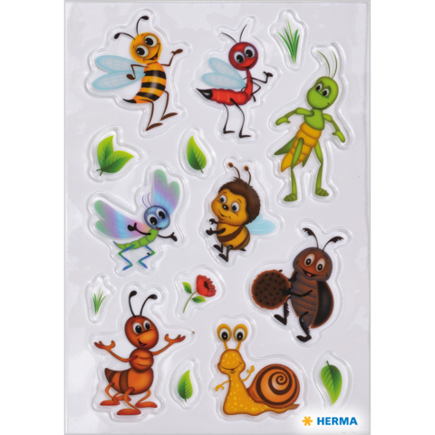 Was krabbelt denn da durch den Garten? Die lustigen Wiesentiere! Mit dabei sind die Biene und die Hummel, der Käfer, die Ameise, die Schnecke und ihre Freunde. Die bezaubernden kleinen Krabbler sind im kindlichen Design gestaltet und ideal für kleine Insekten-Fans. Das Besondere ist die robuste Transpuffy-Folie. Sie ist transparent und selbstklebend und haftet auf fast allen Oberflächen. Ideal als Verzierung für Hefte, Ordner und Mappen. In jeder Packung sind 1 Blatt Sticker mit jeweils 15 Stickern enthalten.
