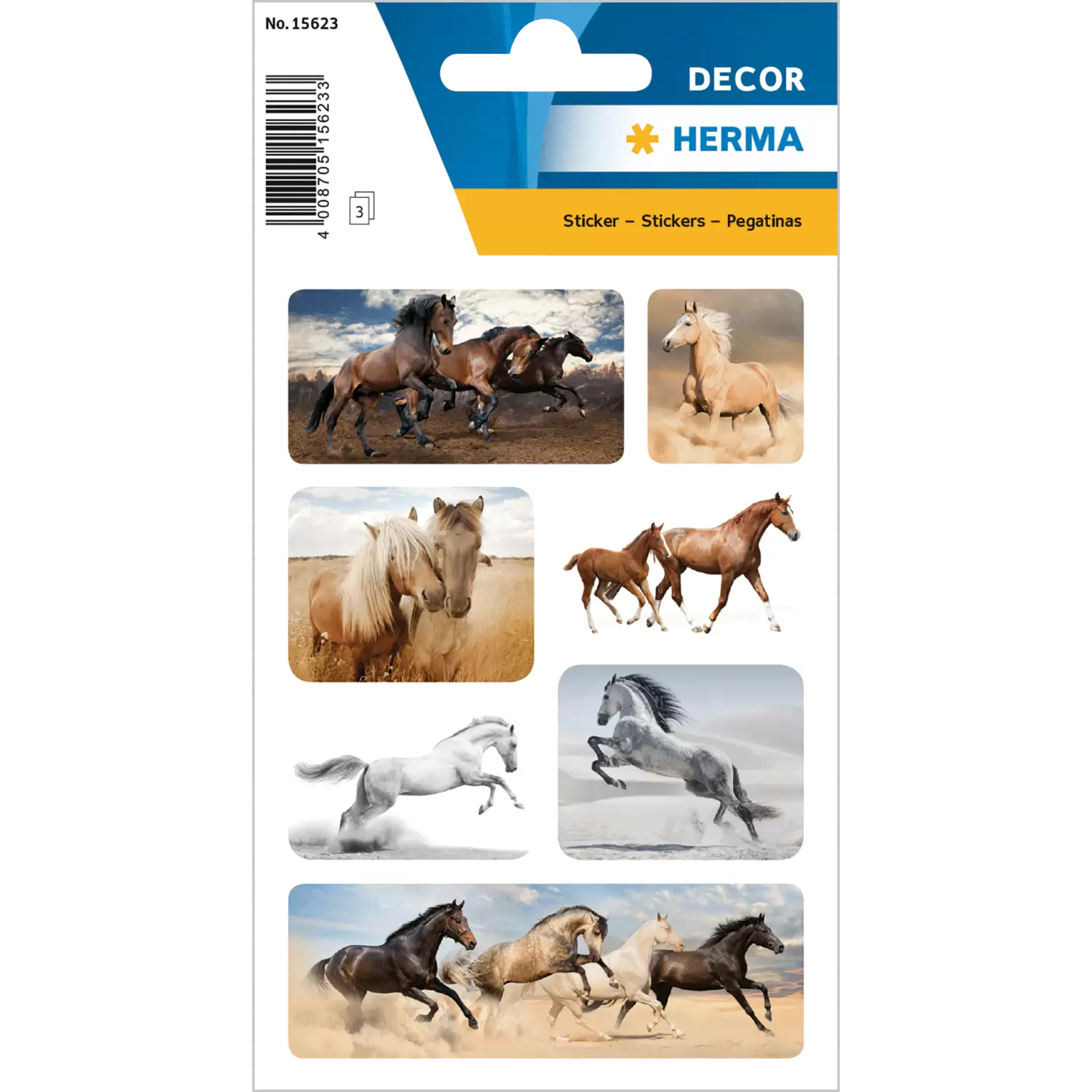Der Inbegriff von Freiheit: Diese imposanten Pferde-Sticker von HERMA beeindrucken sofort und sind genau das richtige Motiv für echte Pferde-Fans. Die kräftigen Wildpferde sind abgebildet in verschiedenen Posen, wie sie galoppieren, buckeln oder entspannt im Gras stehen. Die Sticker mit eindrucksvollen Pferdemotiven können ideal als Mitbringsel zur Pferde-Mottoparty genommen werden oder als kleines Geschenk zum Geburtstag allen Reitern und Pferdefreunden eine große Freude machen. Außerdem halten die Tier-Aufkleber auf diversen glatten Oberflächen, sodass sie beliebig verwendet werden können. Zum Beispiel auf der Putzbox, dem eigenen Pferdeputzzeug oder auf anderen Gegenständen kommen die Schmucketiketten besonders gut zur Geltung. Der Vorteil durch diese Personalisierung ist, dass man die Objekte immer wiede erkennt und sofort weiß, dass sie einem selbst gehören. Aber auch in Freundschaftsbüchern, Stickeralben und auf Schulartikeln, wie Büchern und Heften, können die tollen Pferde-Aufkleber gut wirken und ziehen die Blicke der Freunde und Mitschüler auf sich. In einer Verpackung befinden sich 21 Sticker mit 7 unterschiedlichen Motiven auf 3 Blatt, sodass der Kreativität keine Grenzen gesetzt sind.