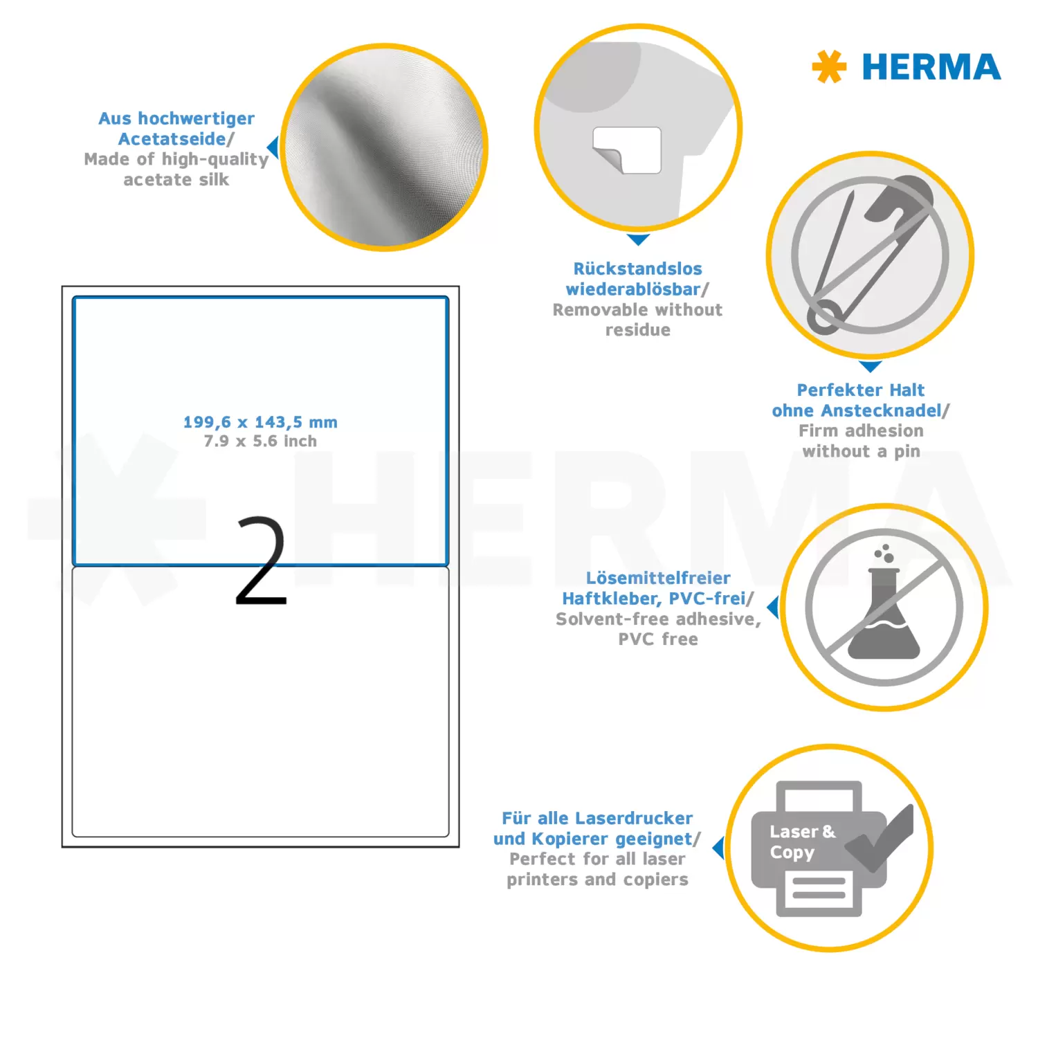 Etiketten aus Acetatseide, auf A4-Blättern, selbstklebend. Ideal geeignet für Seminare, Konferenzen, Messen, oder zur Kennzeichnung von Stoffen, Teppichen und Matratzen. Praktische Alternative zu Plastikschildern: schnell beschriftet, perfekter Halt ohne Anstecknadel. Flexibles Textilmaterial, sicher haftend, gut ablösbar. Achtung: nicht auf Feinleder oder feine Textilien, z. B. Seide oder Samt kleben. Für Laserdrucker, Kopierer, Farblaserdrucker und Farbkopierer. Nicht für Inkjetdrucker geeignet. Kostenlose Softwarelösungen: www.herma.de/software.