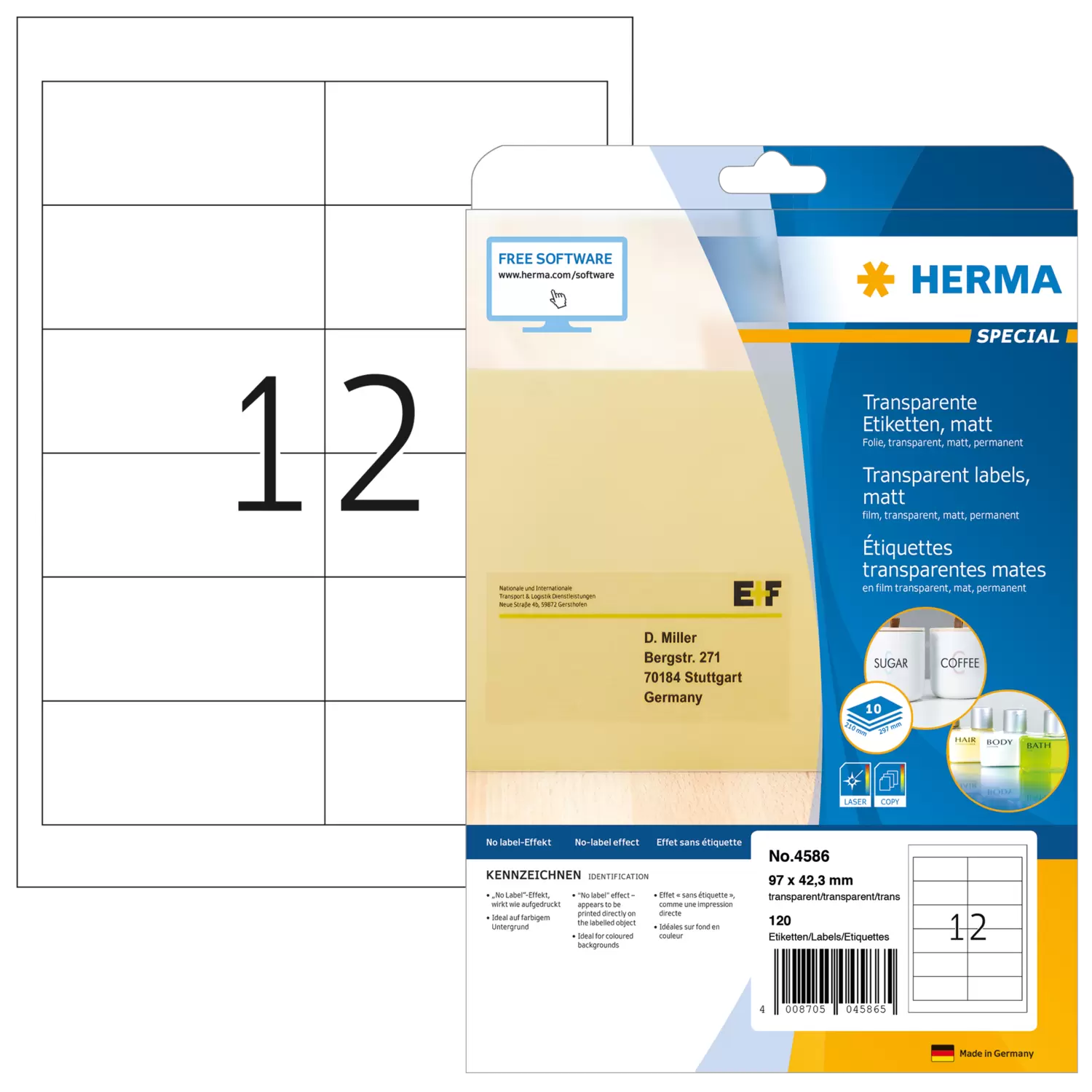 Transparente matte Folien-Etiketten auf A4-Blättern, selbstklebend. Perfekt für optisch anspruchsvolle Anwendungen, ideal auf farbigem Untergrund, Glas, Porzellan, für repräsentative Unterlagen, Aktuali sierungen oder zum Adressieren. No Label-Effekt: Beschriftung wirkt wie direkt aufgedruckt. Wetterfest, alterungsbeständig, Öl und Schmutz abweisend, abwaschbar, temperaturbeständig von -30°C bis +80°C. Störungsfreie Verarbeitung durch Rundum-Sicherheitskante und optimale Planlage. Für Laserdrucker und Kopierer, Farblaserdrucker und Farbkopierer. Nicht für Inkjetdrucker geeignet. Kostenlose Softwarelösungen: www.herma.de/software.