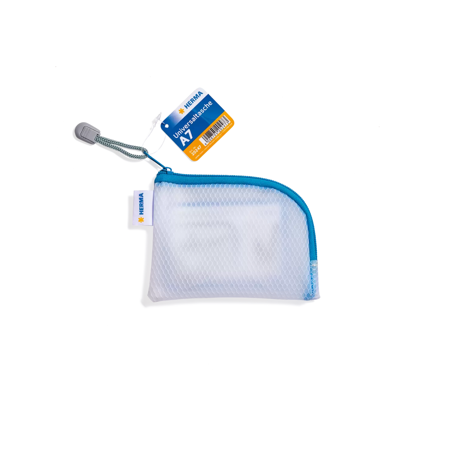Die HERMA Universaltasche A7, (14 x 10 cm), mit praktischem Reißverschluss über Eck in der Farbe blau. Die halbtransparente Tasche ist für viele Zwecke super praktisch: zum Sammeln, Sortieren, Archivieren. Auf Reisen für Kleinkram und als Necessaire, im Büro, in Bad oder der Werkstatt – einfach für jeden Aufbewahrungszweck. Die stabile gitterverstärkte und transparente Folie lässt den Einblick zu und schützt perfekt vor äußeren Einflussfaktoren, wie Verschmutzungen, Dreck und Feuchtigkeit. Das Material zeichnet sich durch seine besondere Widerstandskraft aus und ist abriebfest. Die Aufbewahr- und Sortierwunder sind noch in vielen weiteren Größen erhältlich.