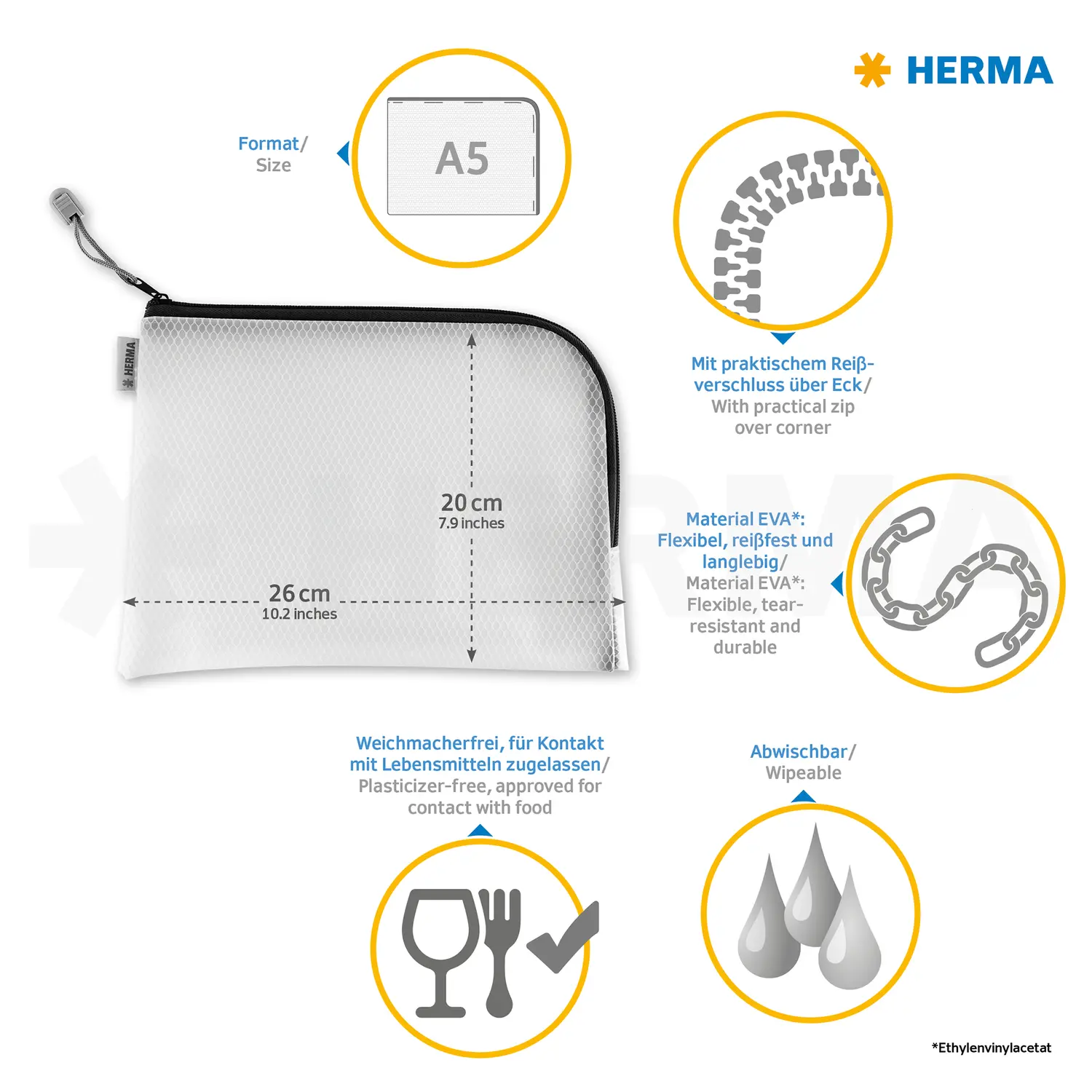 Die HERMA Universaltasche A5, 26 x 20 cm, schwarz eingefasst, mit praktischem Reißverschluss über Eck gibt es auch in den Farben rot, blau, gelb, grün und orange. Die halbtransparente Tasche ist für viele Zwecke super praktisch: zum Sammeln, Sortieren, Archivieren. Auf Reisen für Dokumente oder als Strandtasche für Badehose, Bikini und Sonnencreme, für A5 Hefte und Notizbücher für die Schule und Universität oder für Handy, Ladekabel und Schlüssel oder für viele Dinge in der Werkstatt – einfach perfekt für jeden Aufbewahrungszweck. Die stabile gitterverstärkte und transparente Folie lässt den Einblick zu und schützt perfekt vor äußeren Einflussfaktoren, wie Verschmutzungen, Dreck und Feuchtigkeit. Das Material zeichnet sich durch seine besondere Widerstandskraft aus und ist abriebfest. Die Aufbewahr- und Sortierwunder sind noch in zwei weiteren Größen erhältlich.