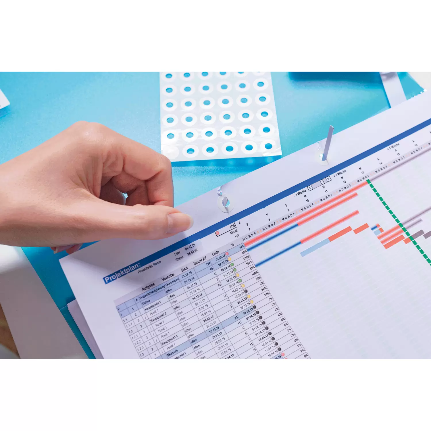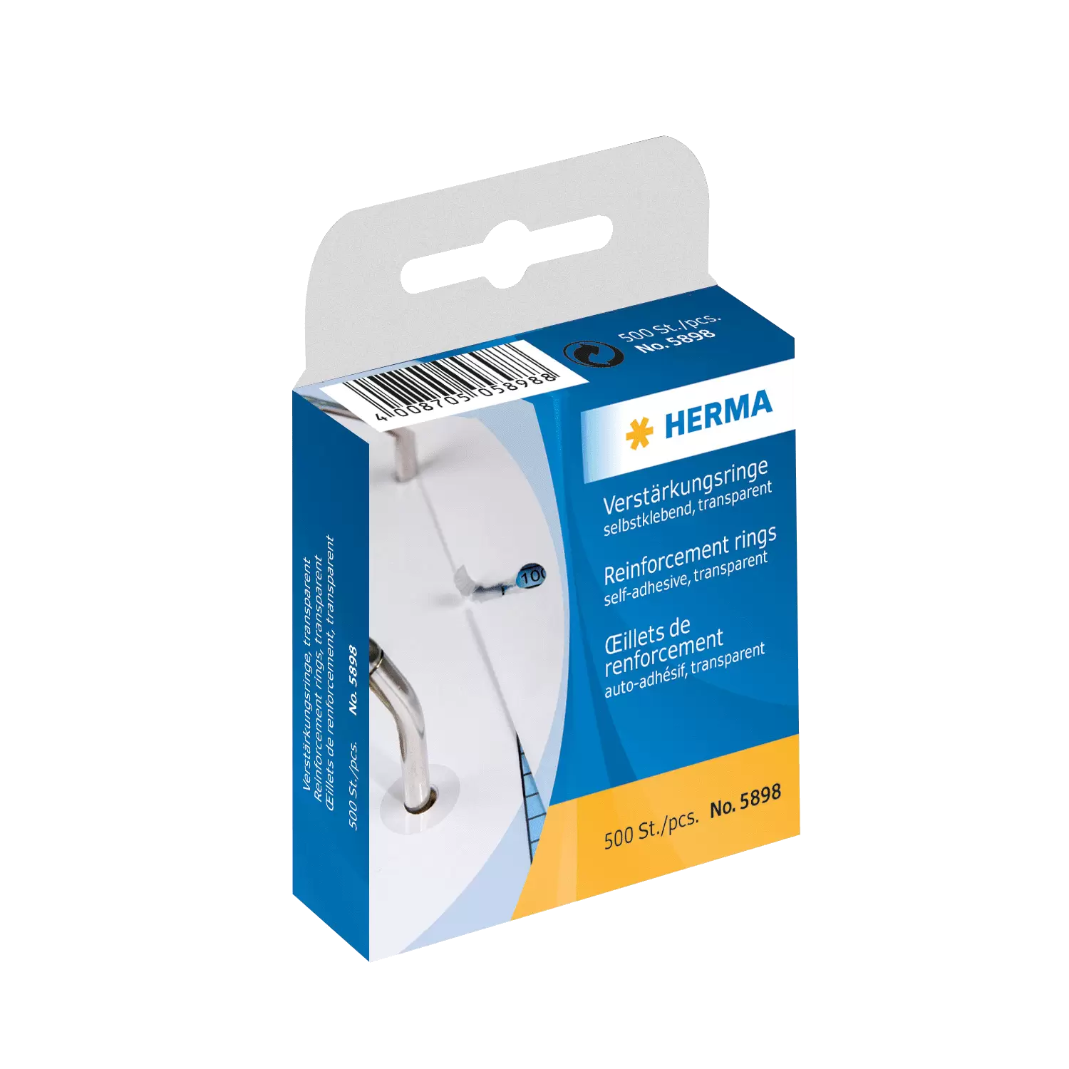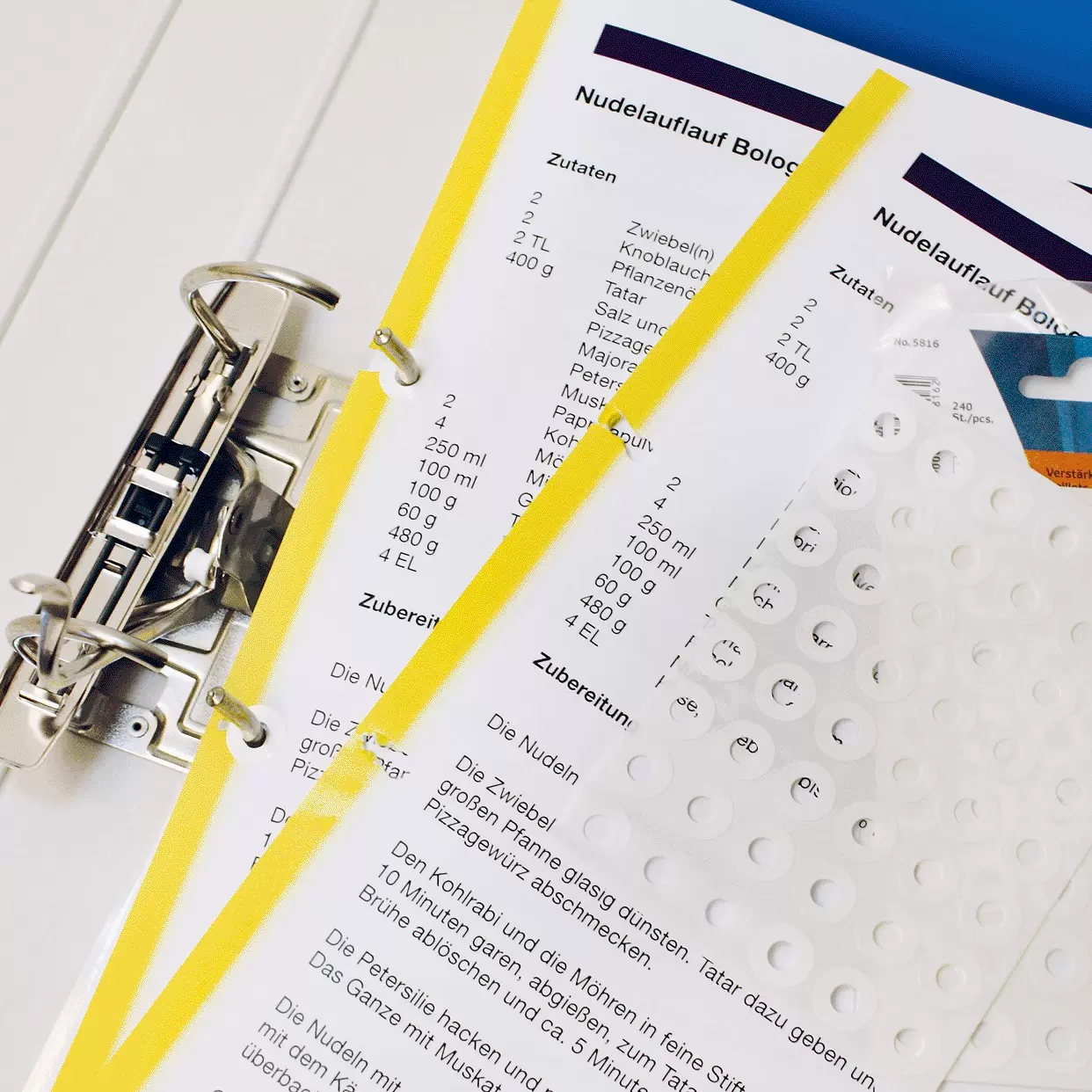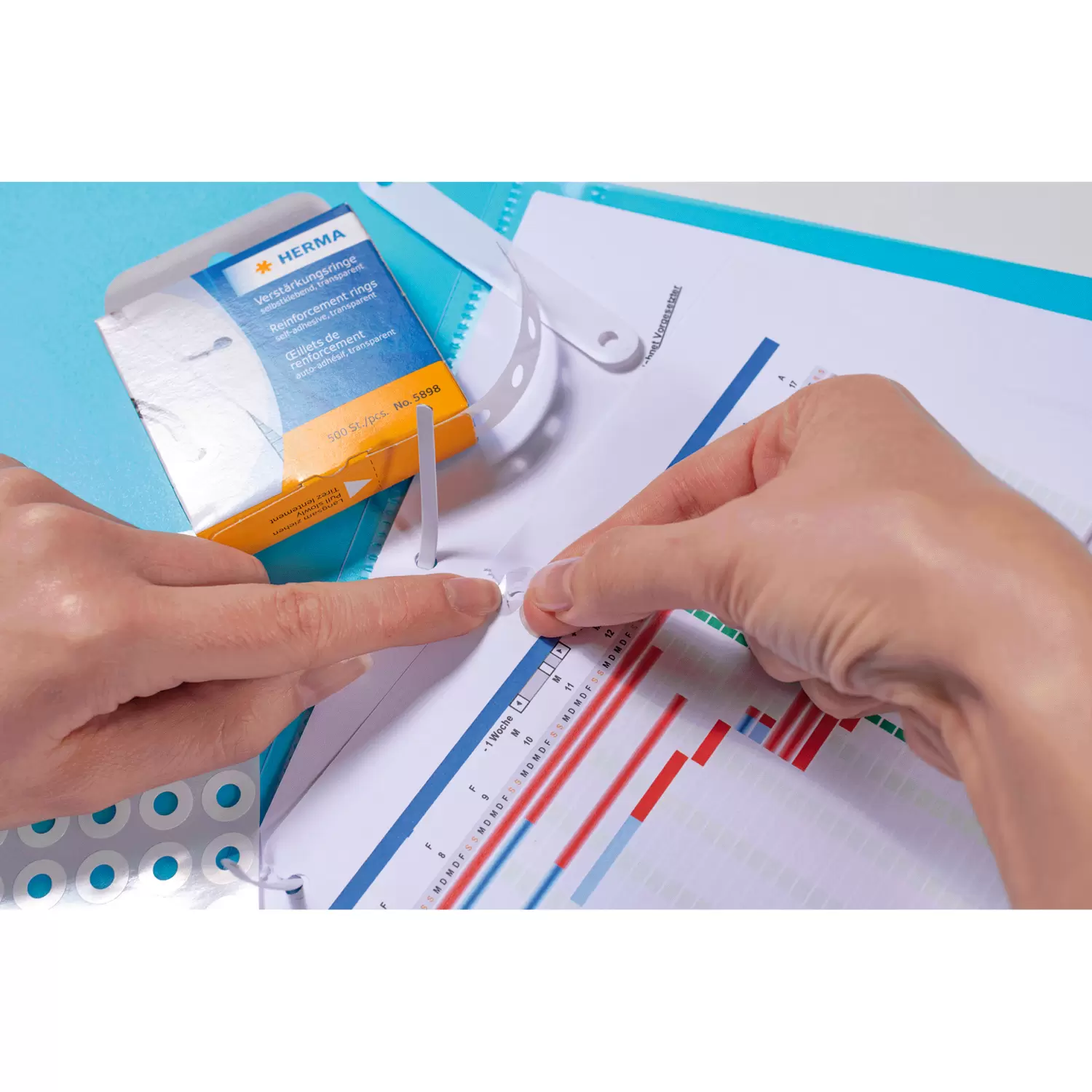 - Selbstklebend, aus reißfester Kunststoff-Folie, zum Reparieren ausgerissener Lochungen