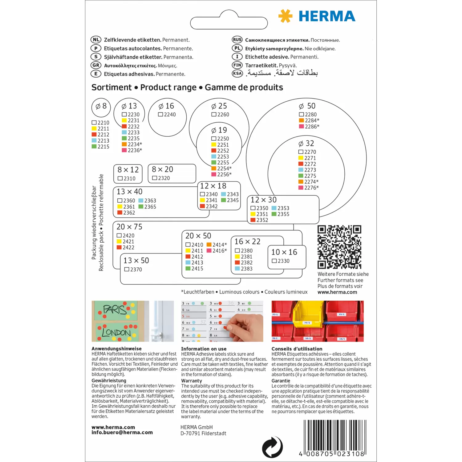 Vielzwecketiketten, selbstklebend. Ideal zum Kennzeichnen, Markieren, Adressieren und Organisieren. Umweltfreundlich: hochwertiges, chlorfrei gebleichtes Spezialpapier, lösemittelfreier Haftkleber. Weißes Etikettenpapier FSC® Mix Credit-zertifiziert. Sicher und permanent haftend auf allen Oberflächen. Blattformat 111 x 170 mm. Zur Handbeschriftung mit allen Schreibgeräten und Schreibmaschinen. Nicht für PC-Beschriftung geeignet, nutzen Sie dafür HERMA Premium A4 Etiketten.