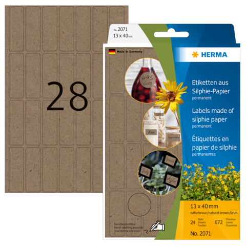 Das besondere Papier aus der Königin der ökologischen Nutzpflanzen - der Donau Silphie. Lebensraum für Bienen, zur Energiegewinnung, ideale CO2 Bindung und ein Mehrwert für das Ökosystem. Ein Beitrag zur Nachhaltigkeit. FSC® Mix Credit-zertifiziert. Anbau in Deutschland, kurze Transportwege, weniger CO2-Ausstoß. Moderner Kraftpapier-Look, aus mindestens 35% Silphie-Fasern. Für direkten Lebensmittelkontakt geeignet. Etikettenpapier recyclebar mit dem Altpapier. Vom Etikett bis zur Verkaufsverpackung: rundum nachhaltig. Zur Handbeschriftung mit allen Schreibgeräten und Schreibmaschinen. Nicht für PC-Beschriftung geeignet, nutzen Sie dafür HERMA A4-Etiketten.