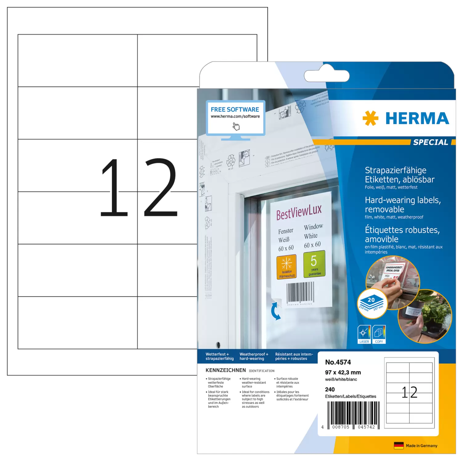 Weiße matte Folien-Etiketten auf A4-Blättern, selbstklebend, wiederablösbar. Ideal für temporäre Auszeichnungen, stark beanspruchte Etikettierungen und im Außenbereich: für Produktauszeichnungen, als Eigentumsetiketten, Schaufensteraufkleber, Hinweis- und Warnschilder, für wechselnde Informationen in Lager und Produktion. Besonders stark haftend, dabei wiederablösbar ohne Kleberückstände zu hinterlassen. Strapazierfähige Oberfläche, wetterfest, alterungsbeständig, Öl und Schmutz abweisend, abwaschbar, temperaturbeständig von -40 bis +60 °C. Störungsfreie Verarbeitung durch Rundum-Sicherheitskante und optimale Planlage. Für Laserdrucker und Kopierer, Farblaserdrucker und Farbkopierer. Nicht für Inkjetdrucker geeignet. Kostenlose Softwarelösungen: www.herma.de/software.